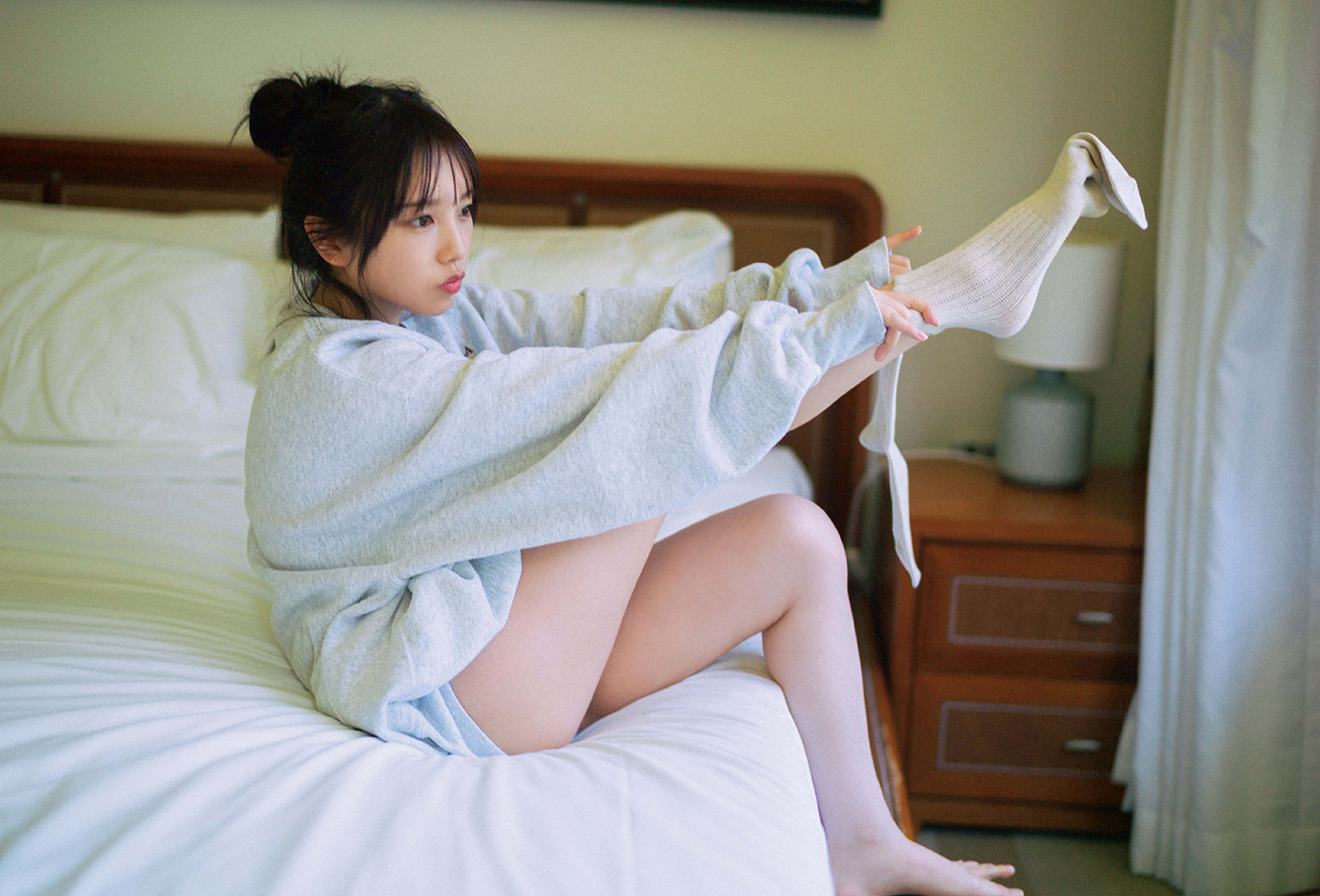 今回公開されたのは、オーストラリア・フィッツロイ島の海でひと泳ぎしたあと、ホテルの部屋でくつろぐナチュラルショット。ベッドで靴下をはく自然体な与田を捉えた。