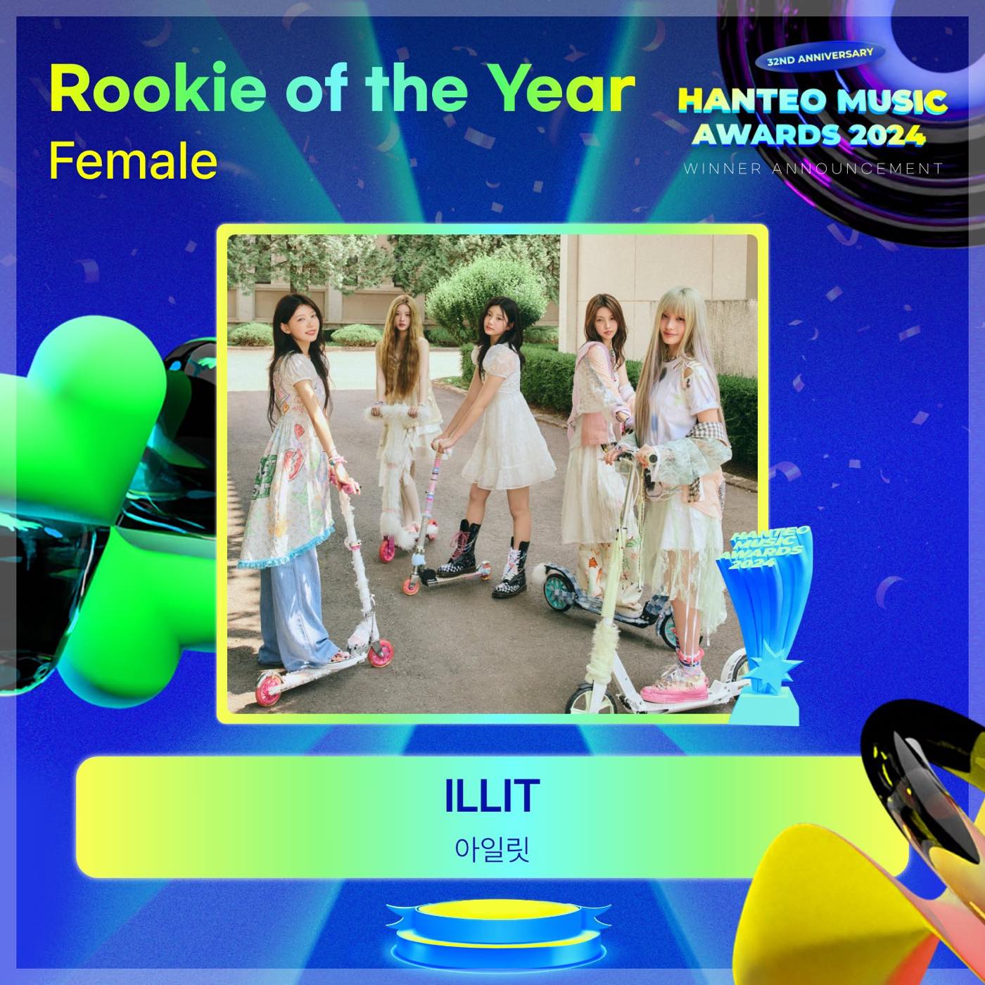 ILLITは『HMA 2024』を含め、国内外の主要授賞式で新人賞5冠王を達成。先立って『2024 MAMA AWARDS』『MMA2024』『第39回ゴールデンディスクアワード』『第66回日本レコード大賞』などで新人賞を獲得。この他にも『MTV Europe Music Awards (MTV EMA 2024)』『Billboard Music Awards 2024 (BBMAs)』『iHeartRadio Music Awards 2025』にノミネートされた。