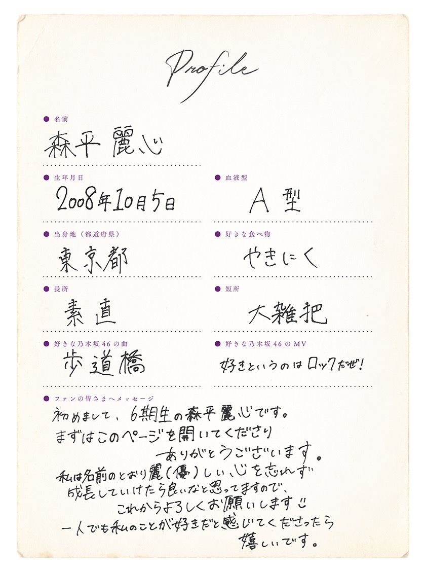 写真は、夏組の集合写真と同様に、学校+制服というシチュエーションで撮影。本人の手書きプロフィールには、生年月日や長所・短所などパーソナルな部分や、好きな乃木坂46の曲、MVといった情報、ファンへのメッセージなどが書き込まれている。
