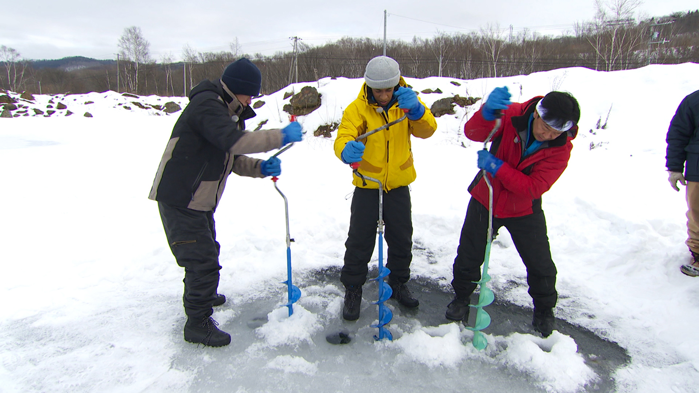 ■気温マイナス7度のなか、池に張った天然氷でカーリングのストーンを手作り!