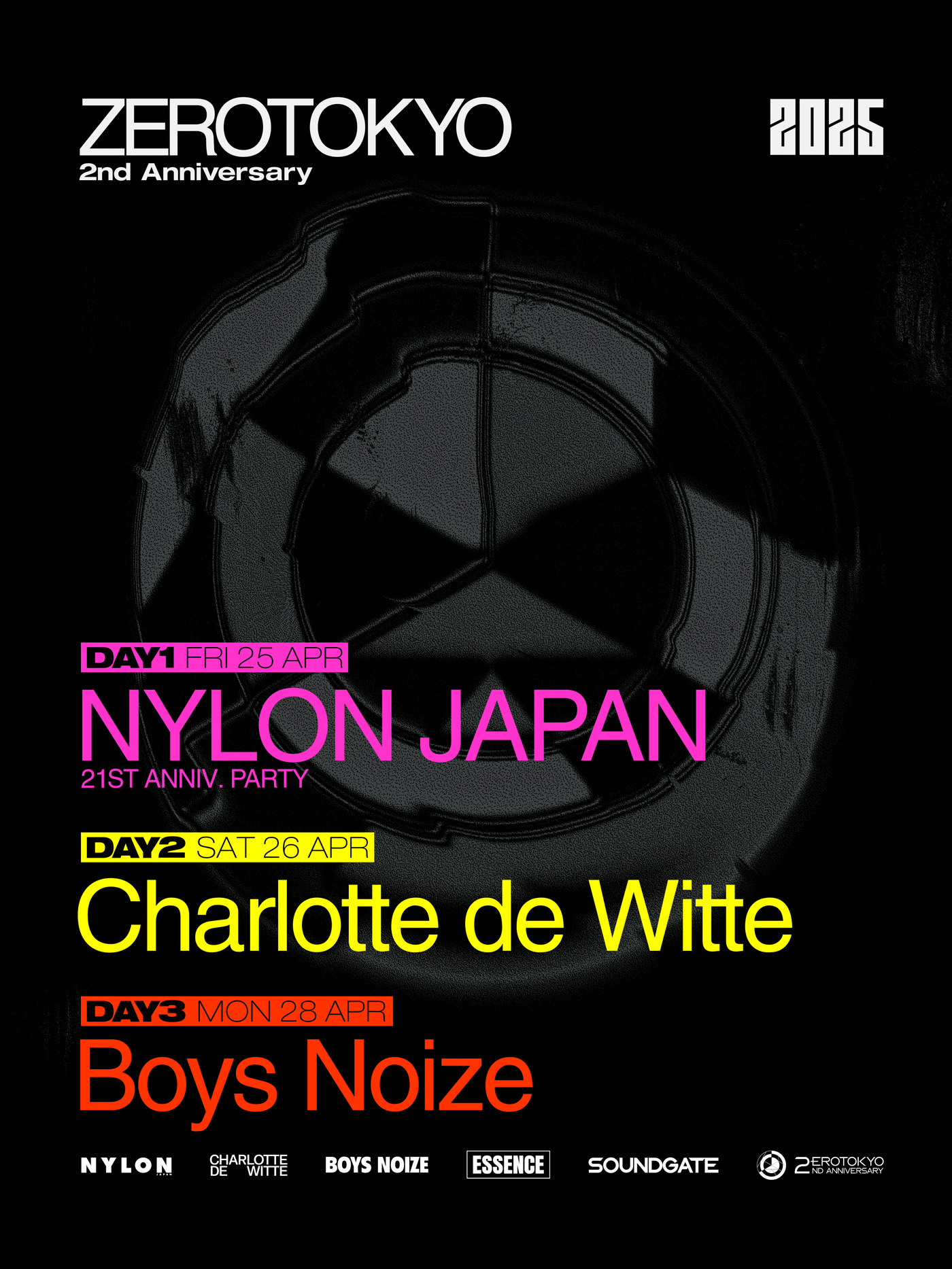 DAY1は、日本のファッション&カルチャーをリードする『NYLON JAPAN』による21周年記念パーティー。ジャンルを超えたアーティストが集結し、音楽とファッションが交差する特別な一夜を演出する。DAY2には、世界のトップフェスティバルやクラブで活躍し、ハードでダークなテクノサウンドを武器に世界を魅了するCharlotte de Witteが登場。圧倒的なグルーブでZEROTOKYOのフロアを震わせる。そしてDAY3には、ベルリン発のエレクトロニックミュージックの先駆者であり、唯一無二のサウンドデザインでシーンを牽引し続けるBoys Noizeが登場。エネルギッシュかつアグレッシブなパフォーマンスで、最終夜を熱狂へと導く。