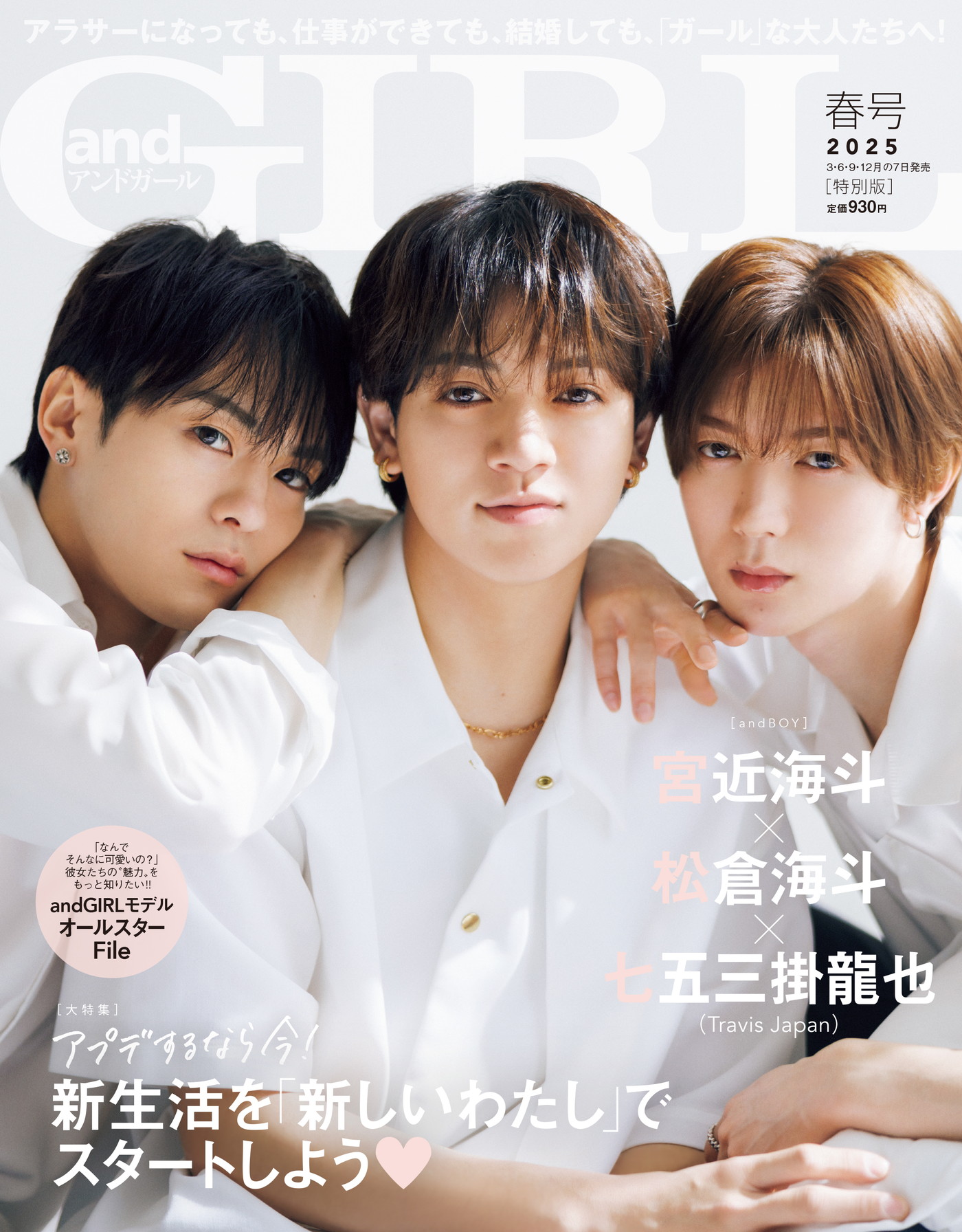 Travis Japanの宮近海斗、松倉海斗、七五三掛龍也が、3月7日発売の『andGIRL』春号特別版表紙を飾る。