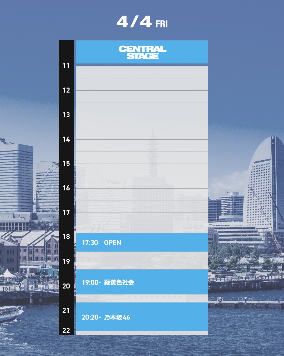 最大級のアリーナステージ「CENTRAL STAGE」で初日のオープニングを飾るのは、緑黄色社会。各日のトリは乃木坂46、キタニタツヤ、Creepy Nutsが務める。