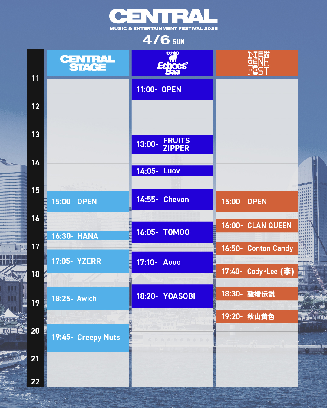 『CENTRAL』は、Kアリーナ横浜、横浜赤レンガ倉庫 赤レンガパーク特設会場、KT Zepp Yokohama、臨港パークの4会場を舞台に、横浜全体を巨大なフェス空間にするイベントで、これまでにCreepy Nuts、乃木坂46、YOASOBIらの出演が発表。