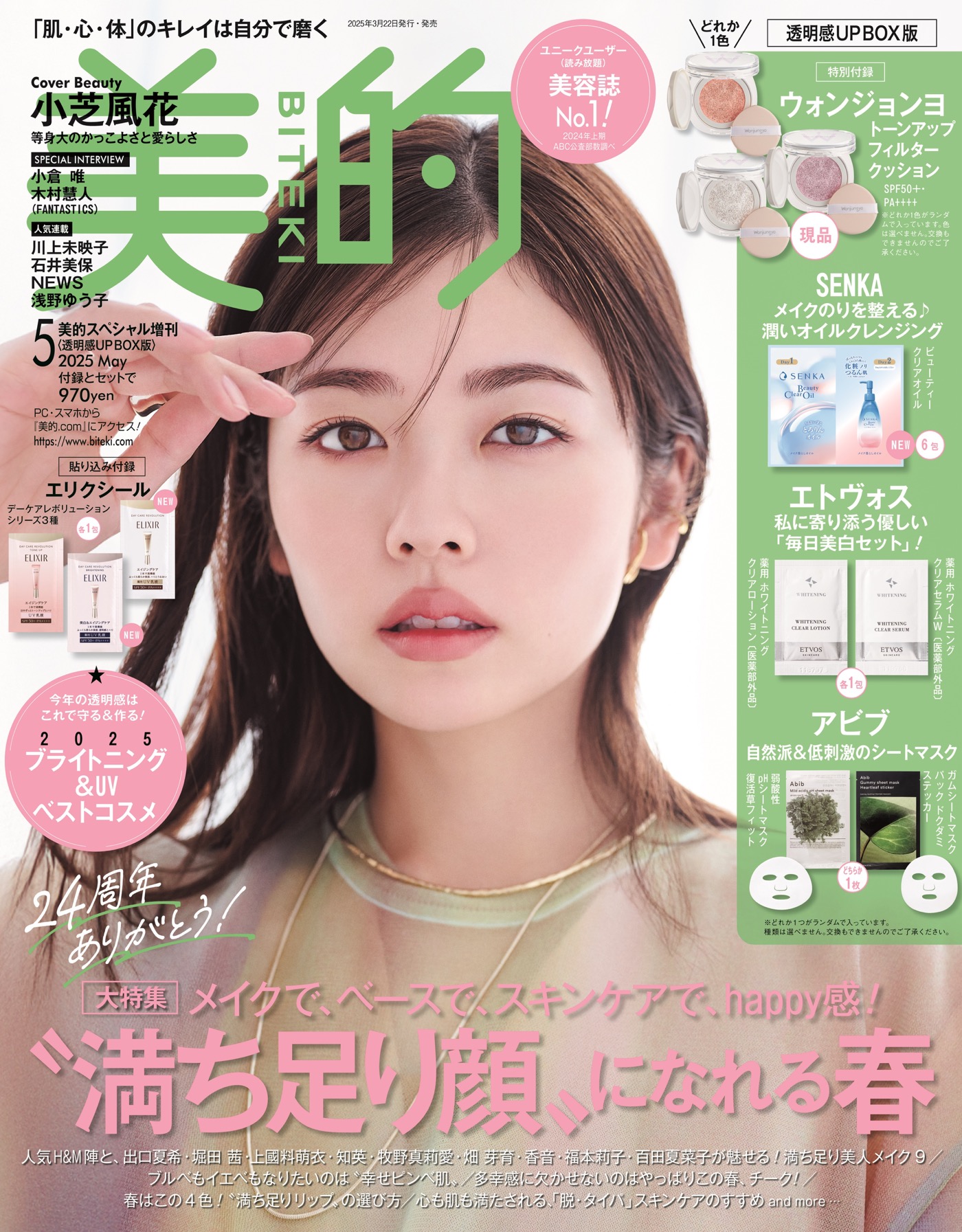 今号で創刊24周年を迎える『美的』。ゲランのオイル状美容液・ファンデーション・オーデトワレの3点セット(すべて新作)やキャンメイクの現品ティントリップ、ウォンジョンヨのトーンアップ フィルタークッションのランダム現品など、「ハリ蜜BOX版<通常版>」「うるツヤセット版」「透明感UP BOX版」の3バージョンで異なる豪華付録が目白押しだ。さらに共通付録も大充実の内容となっている。表紙は小芝風花。