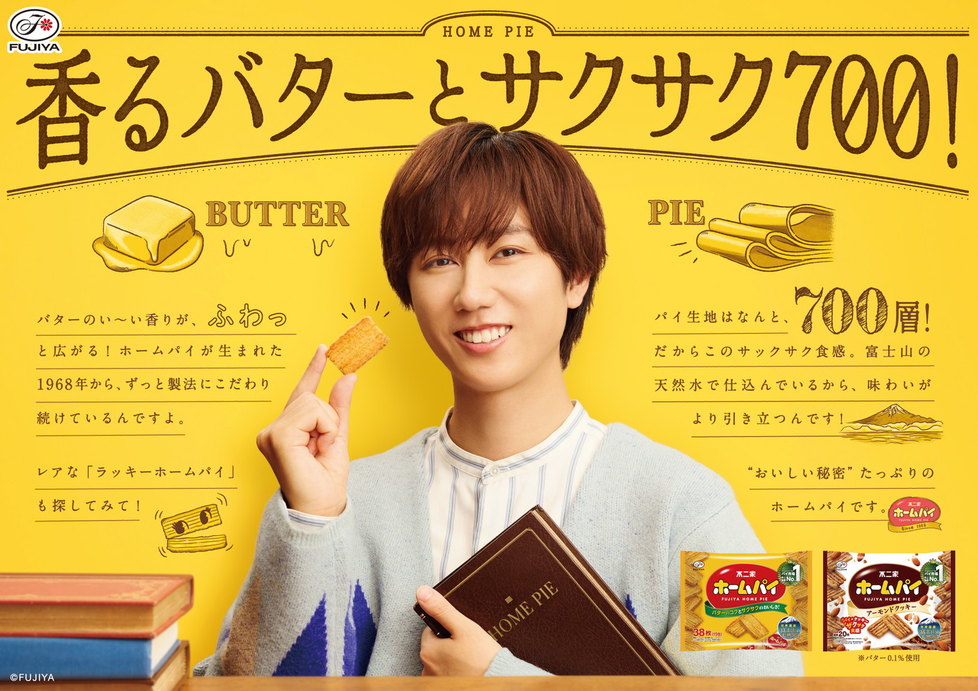 阿部:昔から食べているお菓子だったので、うれしかったですね。小さい頃って、チョコとか甘くておいしいお菓子がいっぱいあるなかで、このバターのおいしさに気づけた俺、大人かも? みたいなことを(子どもながらに)思っていました。「ホームパイ」ばかり食べていた時期があったので、そのときの自分にこの(CM出演の)ことを知らせたら、すごくびっくりしてくれるんじゃないかなと思います。「ホームパイ」はたくさんの人に愛されているお菓子なので、僕もそういう存在になれるように「ホームパイ先輩」に続きたいなと思います。Q. CM撮影の感想、CMの⾒どころは?