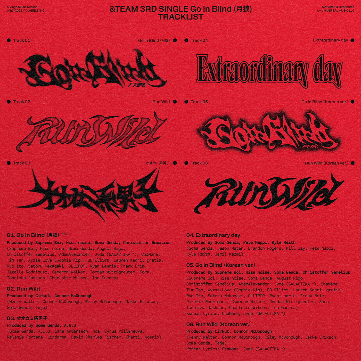 タイトル曲「Go in Blind(月狼)」には、デビュー以来&TEAMのプロデュースを手掛けるSoma Gendaのほか、BTSの「FAKE LOVE」やTOMORROW x TOGETHER「Sugar Rush Ride」、LE SSERAFIM「Easy」を手掛けたSupreme Boi 、BTS「Magic Shop」やTOMORROW x TOGETHER 「20cm」を手掛けたHiss Noiseといった多くのK-POPヒット曲を生み出している制作陣が参加している。