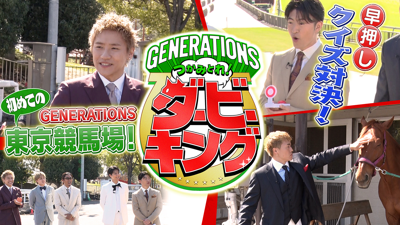 GENERATIONSメンバーが東京競馬場を巡りながら「ダービーキング」の座をかけて、日本ダービーや競馬に関するクイズに挑戦。GI優勝経験のある誘導馬と触れ合ったり、競馬博物館を訪れたり、普段は入れない特別な場所に入ったり、過去のレースを観戦したりと、メンバー6 人が楽しみながら競馬を学ぶ姿は必見だ。