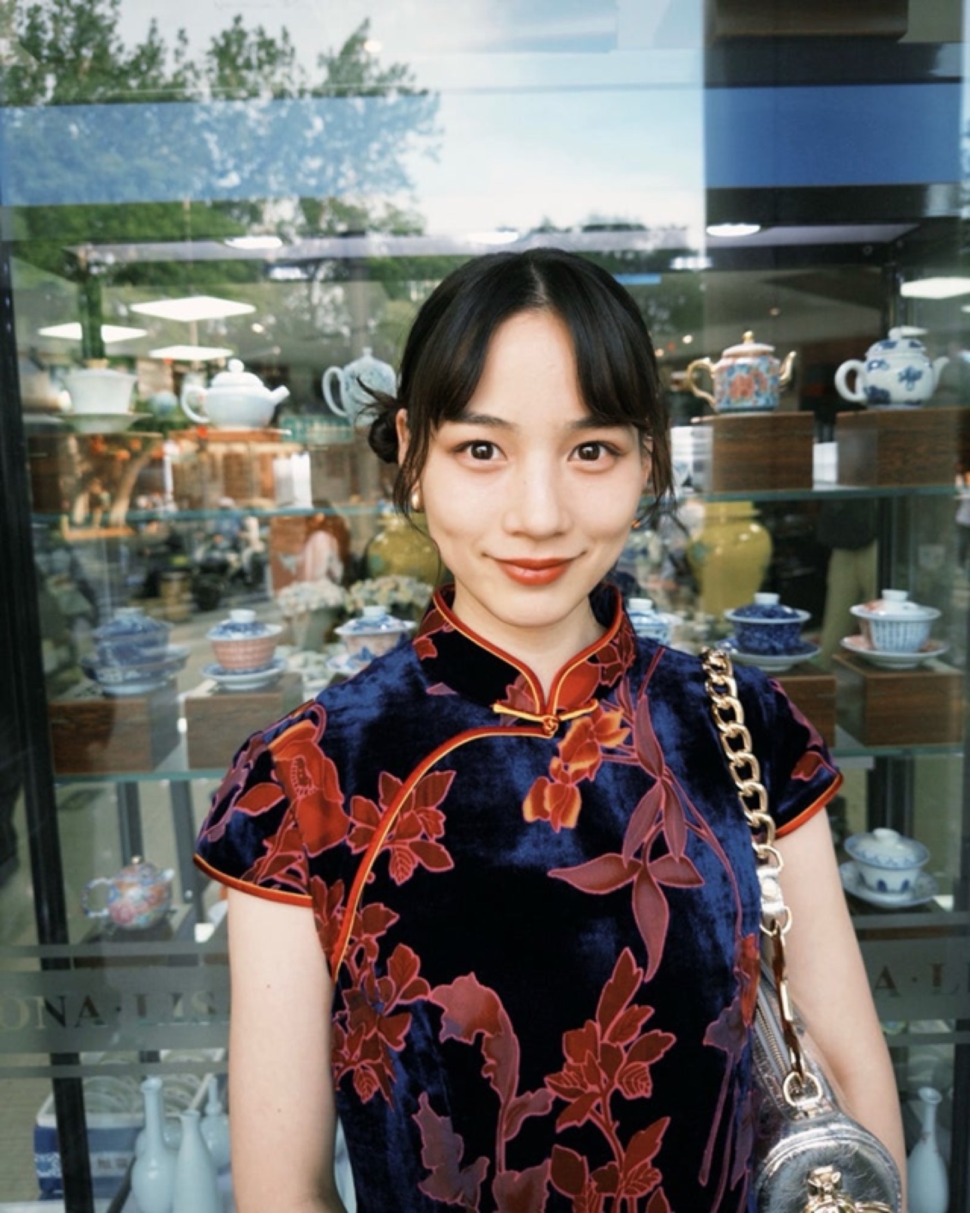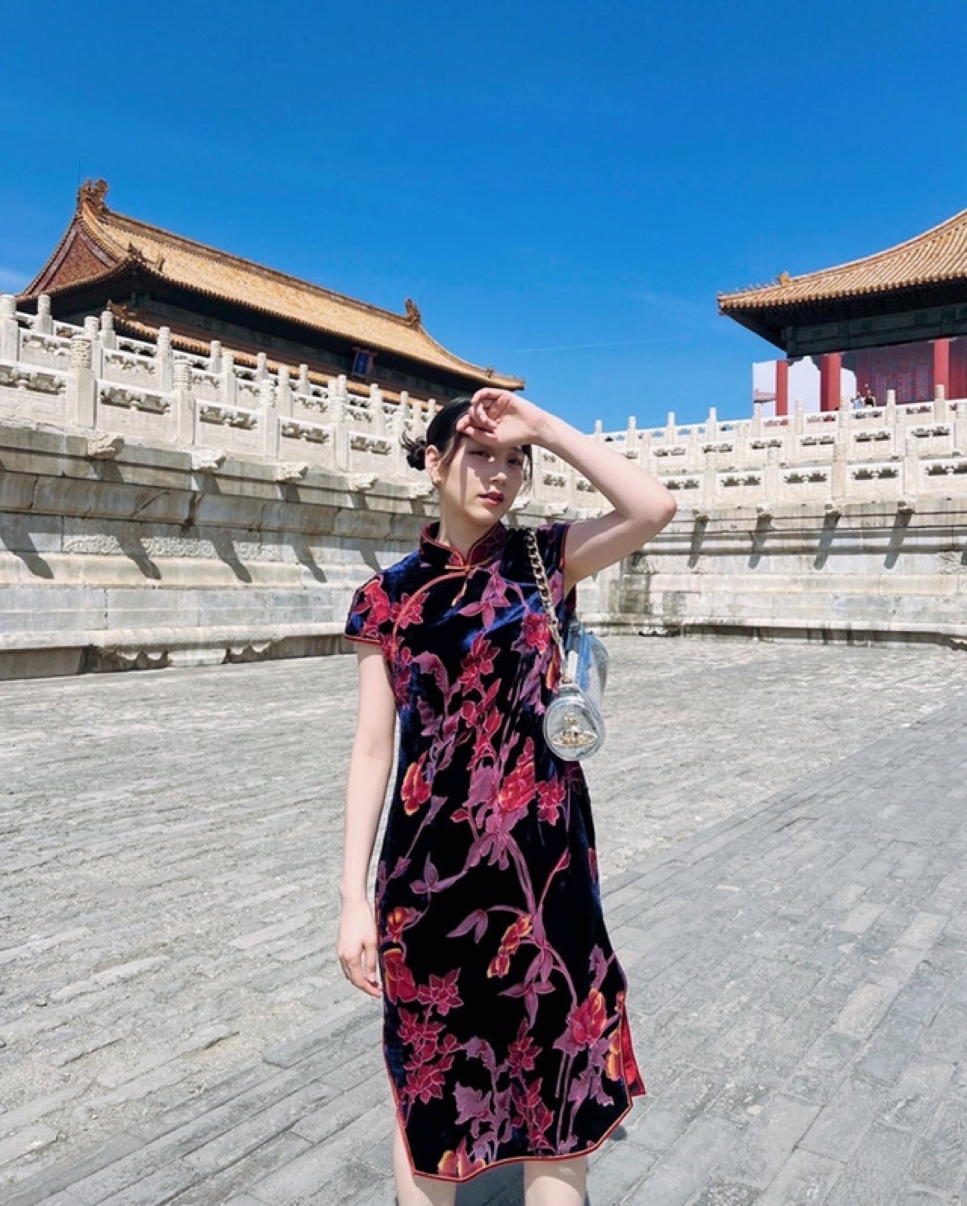 絵文字を交えながら「北京では、商店街で見つけたチャイナドレスを着て、とても派手な可愛い食器を買った」「無い前提で、不死鳥と龍と虎と麒麟の刺繍が入ったドレスを探してみたんだけど見つからず。あるのだろうか?」と綴り、ツインのお団子ヘアに、美肌引き立つ黒地に朱色の花柄があしらわれた艶やかなチャイナドレスを身に纏った姿や、現地で購入した華やかな模様の食器の写真などを公開した。