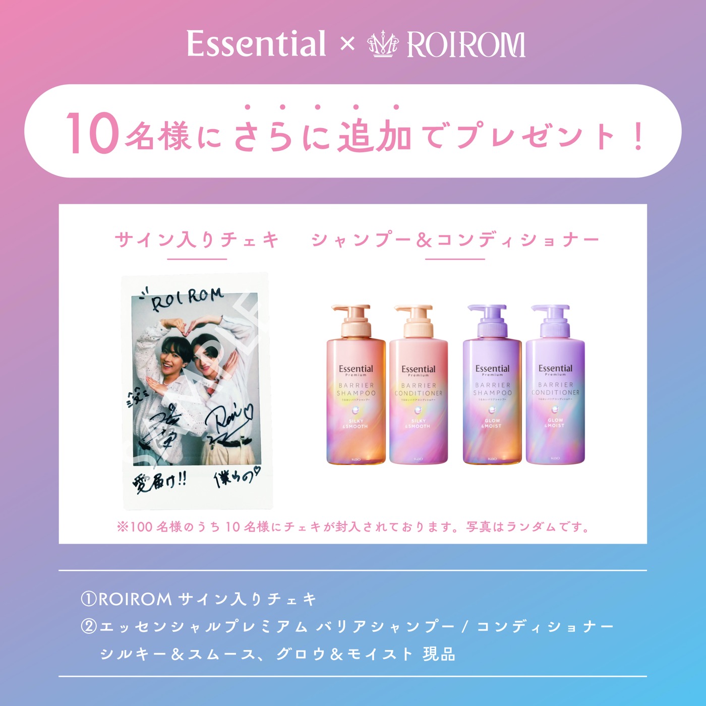 “エッセンシャル”公式X(旧Twitter)では、今回のコラボを記念したキャンペーンを開催。“エッセンシャル”商品に加え、オリジナルデザインのクリアファイル、ROIROM直筆サイン入りチェキが当たる豪華なプレゼントキャンペーンとなる。キャンペーンの詳細は、“エッセンシャル”公式Xまで。
