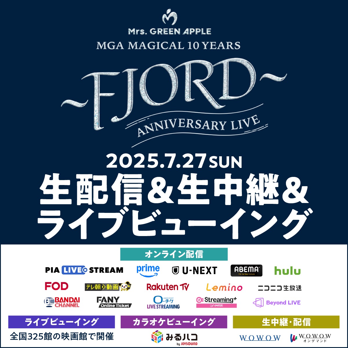 Mrs. GREEN APPLEが、7月26日・27日に神奈川県・山下ふ頭で開催する、2日間で10万⼈動員予定のライブ『MGA MAGICAL 10 YEARS ANNIVERSARY LIVE 〜FJORD〜』(読み:フィヨルド)の2日目の公演が、WOWOWにて生中継、計15の配信プラットフォームにて生配信、全国325館での映画館にてライブビューイング、そして“みるハコ”でのカラオケビューイングと、様々なプラットフォームで生中継・生配信されることが発表された。