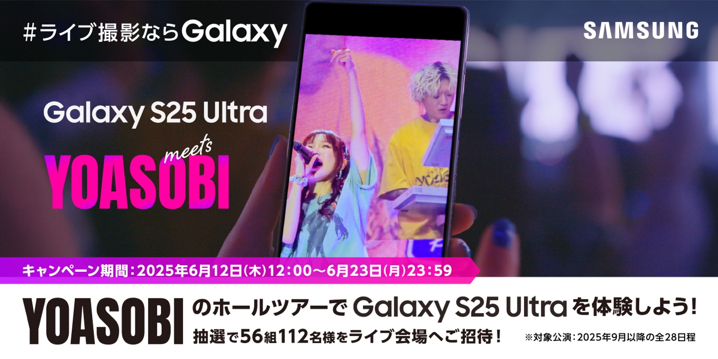 “Samsung Galaxy S25 Ultra”をレンタルし、実際に撮影体験しながらライブを楽しめる招待チケットキャンペーン『#ライブ撮影ならGalaxy 「Galaxy S25 Ultra meets YOASOBI」YOASOBIのホールツアーでGalaxy S25 Ultraを体験しよう!』が、6月12日12時より開始となる。