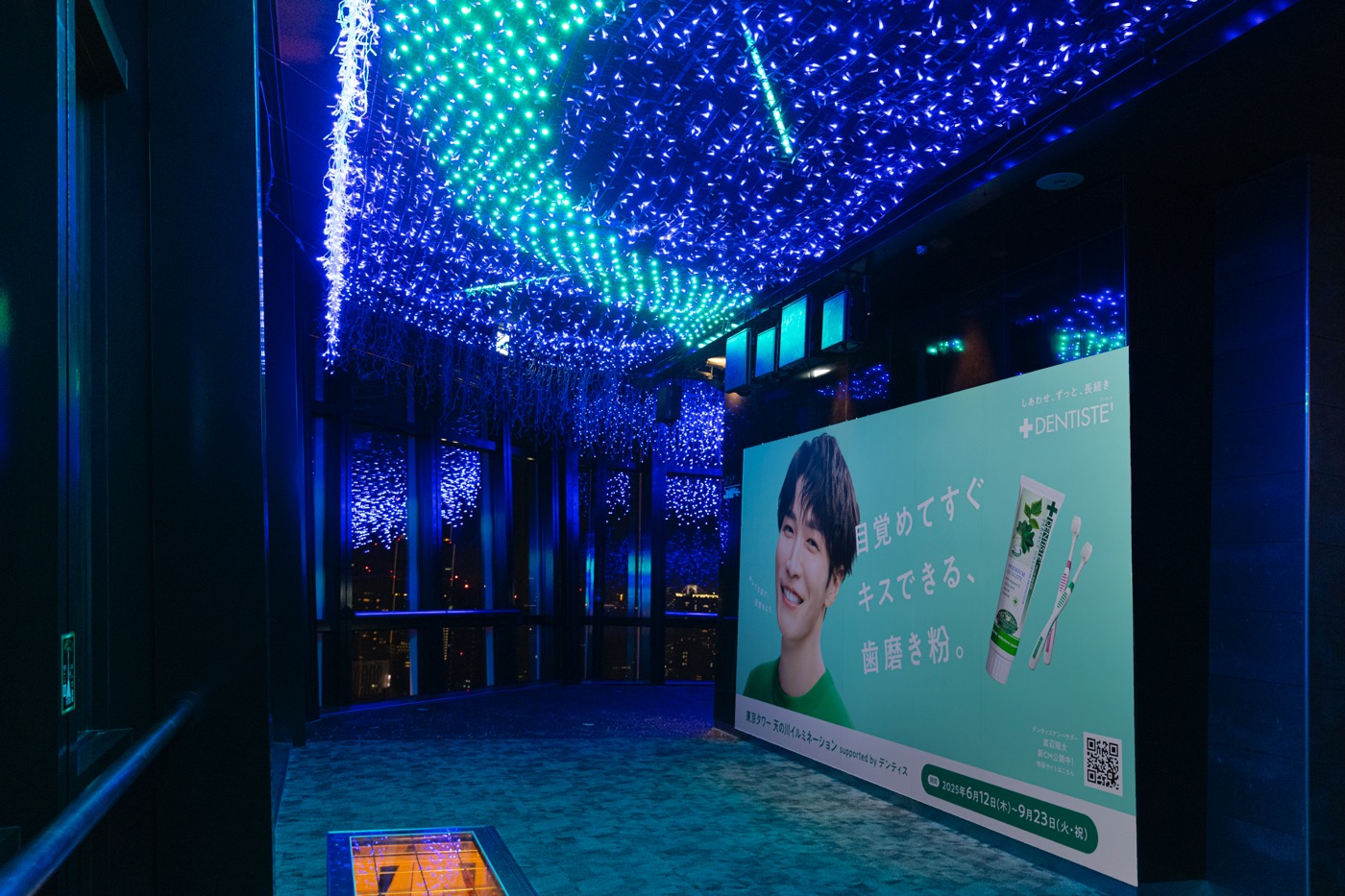 日本を代表するデートスポットである東京タワーの展望デッキにて、 6月12日から9月23日の期間中、 “デンティス”カラーのイルミネーションが点灯。ブランドアンバサダーを務める渡辺翔太の巨大壁面ポスターや等身大パネルの掲示、巨大ビジョンでの動画放映、ここでしか見られない渡辺翔太からのメッセージなども見ることができる。