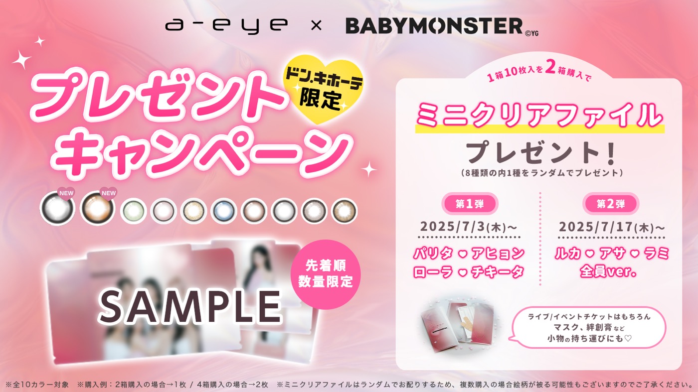 このたび、BABYMONSTERのモデル就任と新色発売を記念して、ドン・キホーテでノベルティプレゼントキャンペーンがスタート。ドン・キホーテでa-eye対象商品を購入した人に、“a-eye×BABYMONSTER 限定ミニクリアファイル”がプレゼントされる。詳細はa-eyeの公式SNSをチェックしよう。