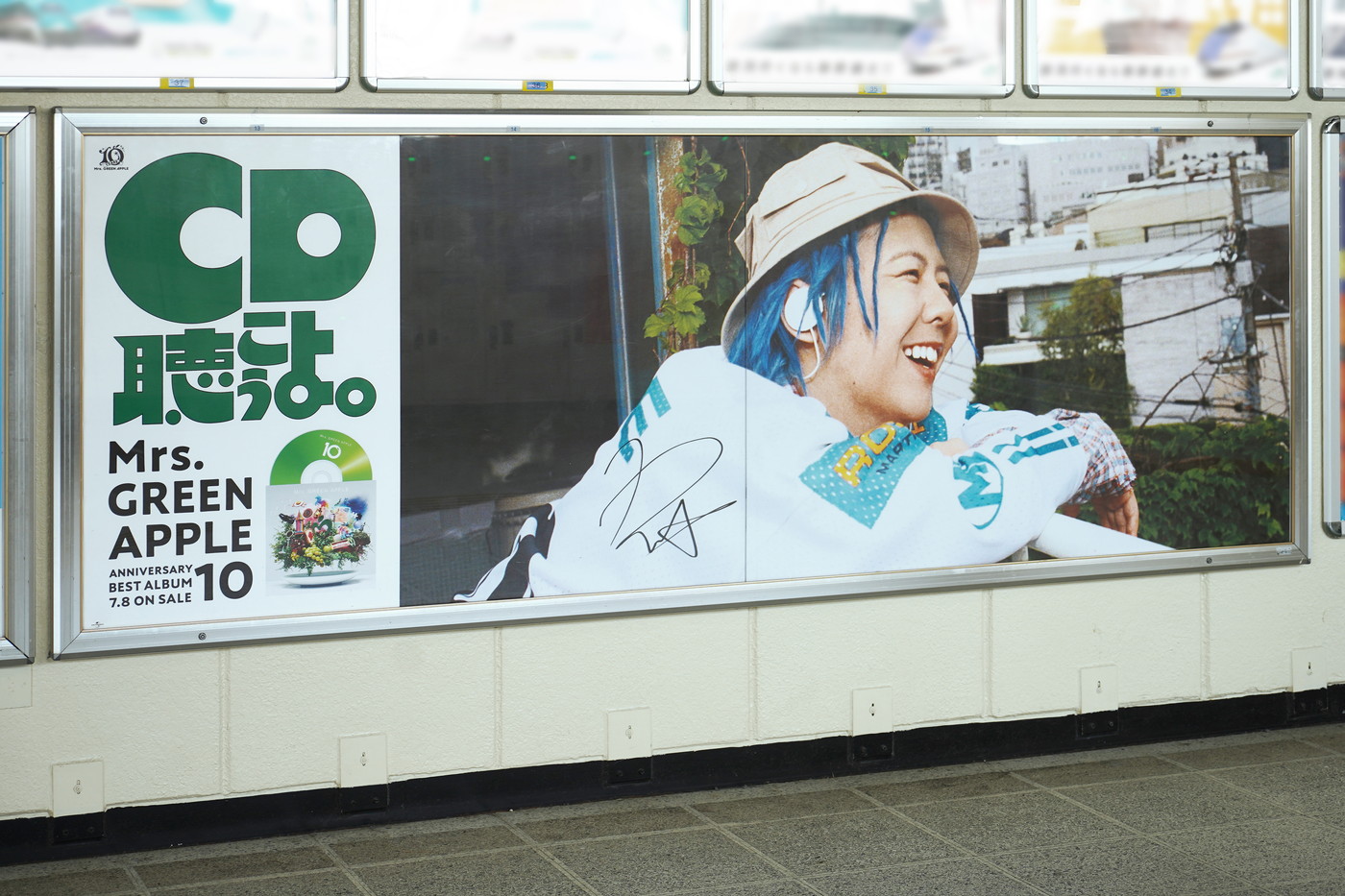 JR山手線トレインジャックの車体は、10周年ロゴをあしらったラッピング仕様に。車内のトレインチャンネルなどでは、どこよりも早く『10』のCMを放映(音なし)。メンバー3人が“CDの聴き方”をレクチャーするCMや、収録曲のMVなどが流れる。また、中づり広告やドア横ポスターには、CDの素敵なところを紹介する広告や、ミセスにゆかりのある人に書いてもらった『10』のPOPがついた広告も掲出。