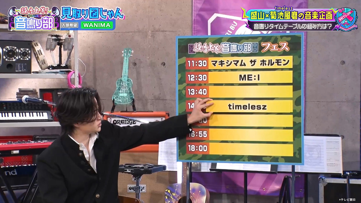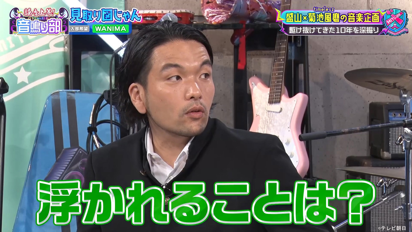 「天下を目指すには…音楽だ!」との麒麟・川島明の言葉をきっかけに「部長・盛山×副部長・timelesz菊池風磨」のタッグで令和の最強「うた」番組を目指す大人気企画「騒音上等!音鳴り部」。軽音部に扮した盛山と菊池が、新入部員(アーティスト)を勧誘していく。今回はロックバンドのWANIMA(KENTA、KO-SHIN、FUJI)を招き、彼らのこれまでの歩みを聞いた。