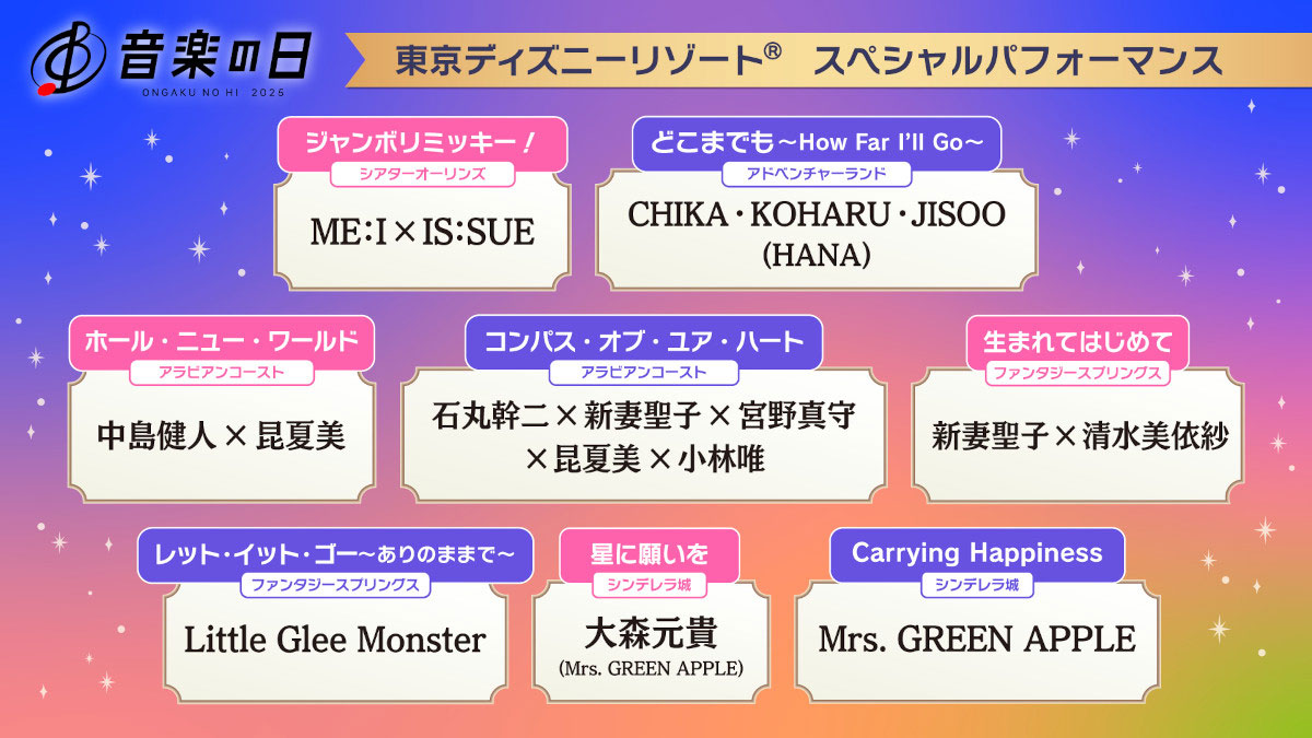 今年の『音楽の日』では、「ココロときめく場所」である東京ディズニーリゾート(R)から、スペシャルパフォーマンスを届ける。東京ディズニーランド(R)および東京ディズニーシー(R)の様々なエリアを舞台に、珠玉の名曲の数々を豪華アーティストたちが歌い繋ぐ。