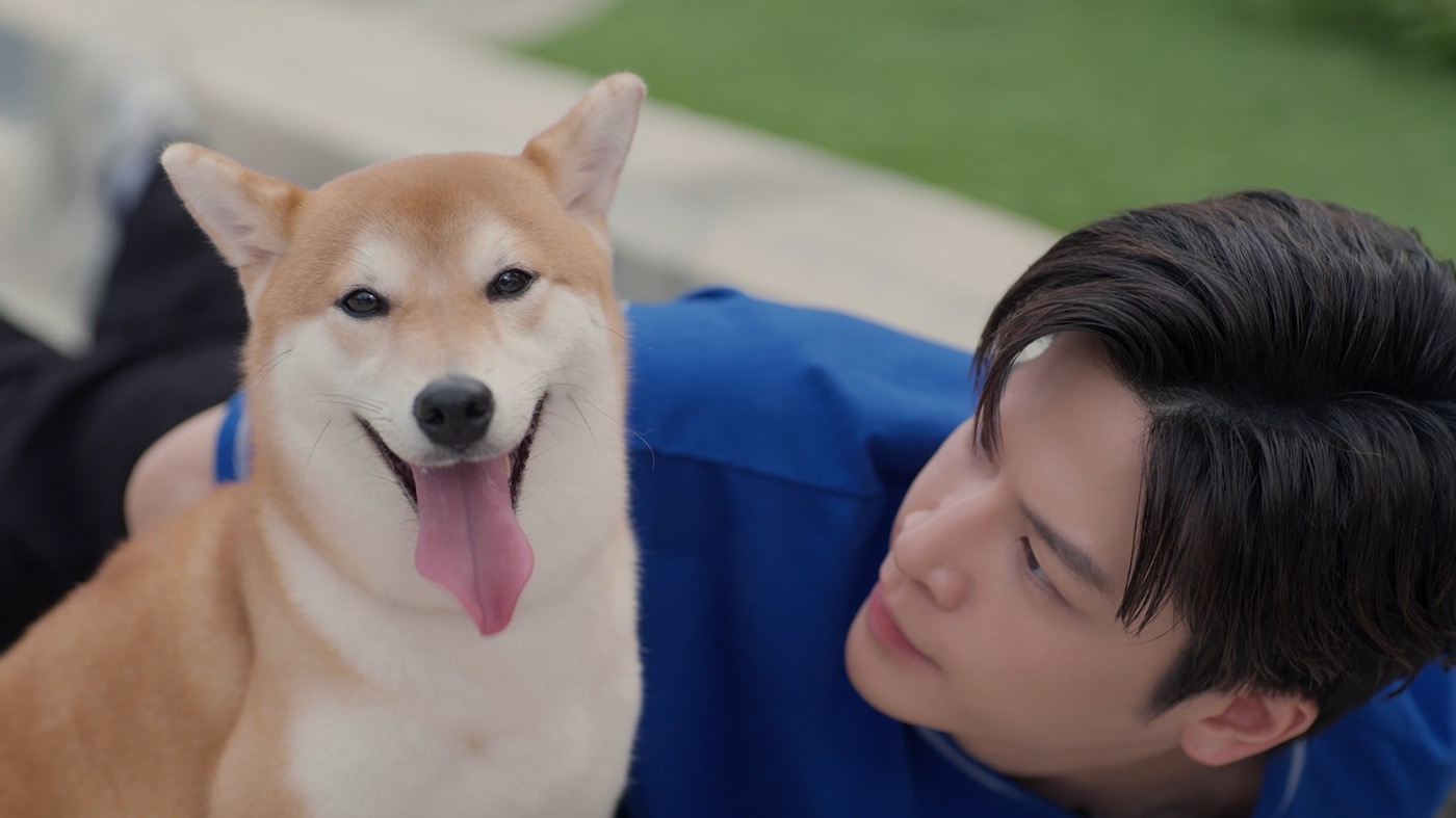 ■柴犬を抱きかかえたジュンジ(向井康二)と、ジュンジを支えるヒル(マーチ=チュターウット・パッタラガムポン)が超接近!