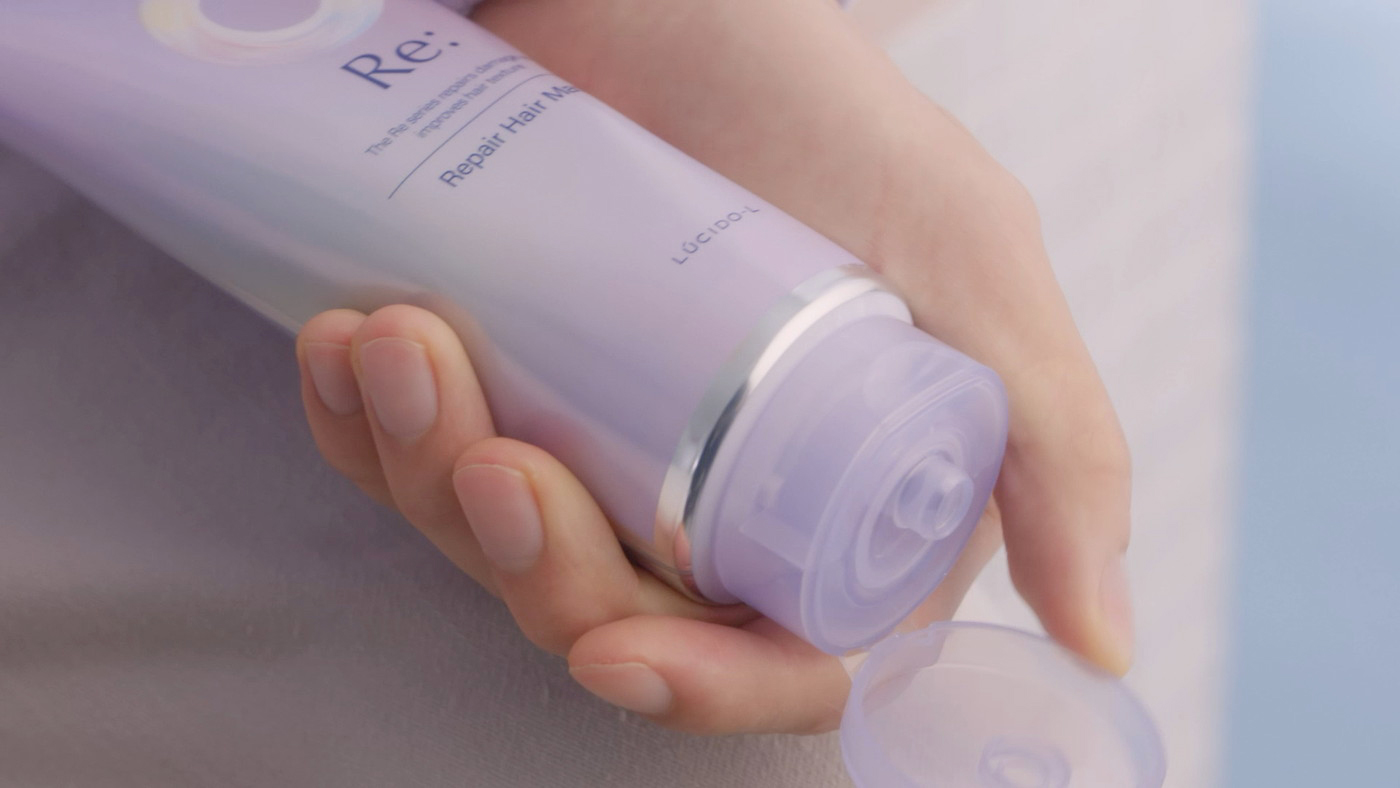 JINがRe:(アールイー)シリーズのヘアマスクのキャップを開けると、Re:(アールイー)シリーズの再整美容を象徴する「再整リング」が出現し、JINに接近。再整リングが回転するなかで、JINの美しい髪がなびく様子が様々な角度から映し出される。