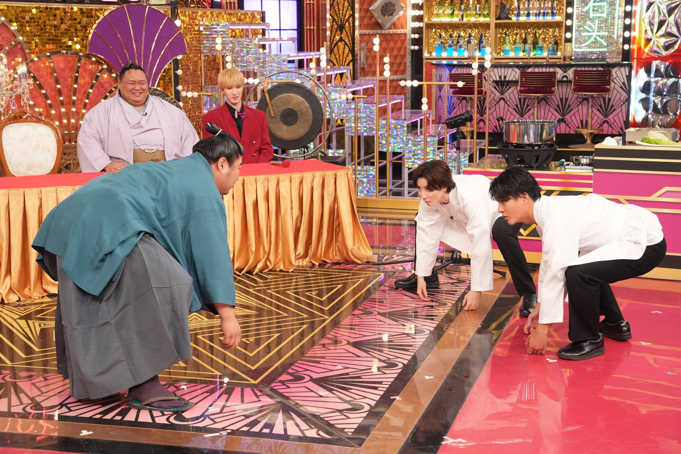 SixTONESが2組に分かれて「至極のちゃんこ」を作り、力士に振る舞うガチ対決を繰り広げる。