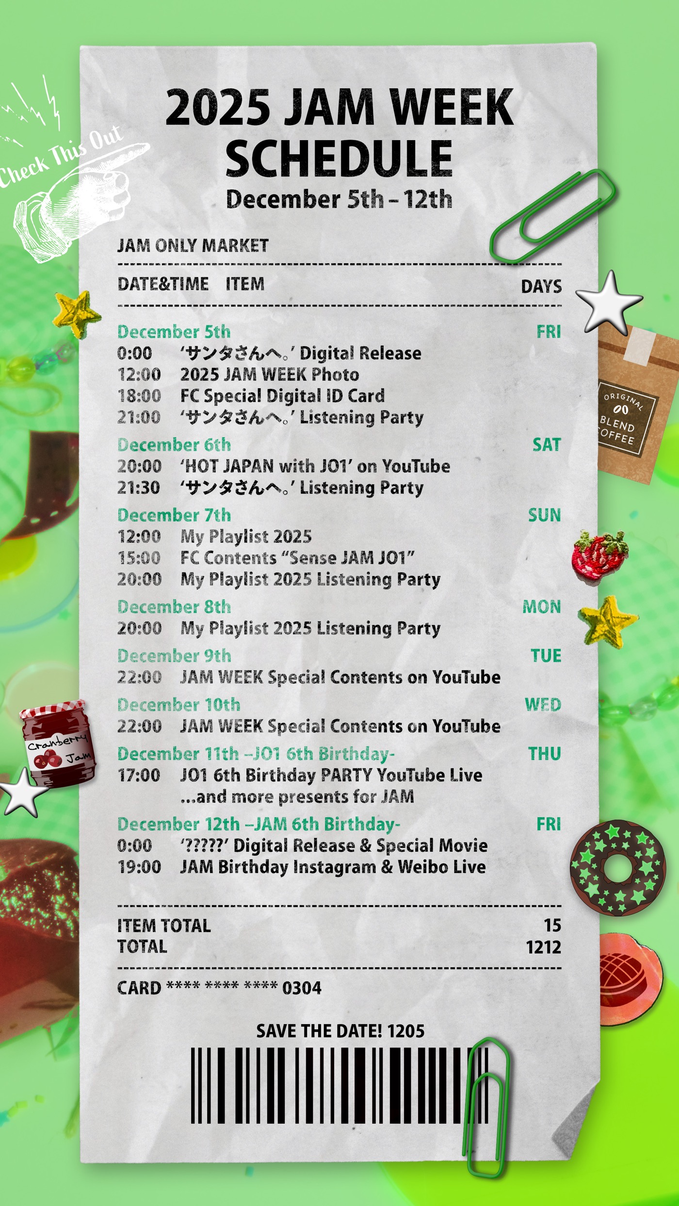 12月11日に結成6周年を迎えるJO1。これを記念し、JO1とJAM(ファンネーム)の特別な日を祝う毎年恒例の企画「JAM WEEK」が、2025年も実施される。12月5日0時には、2024年のツアーでサプライズ披露され、メンバーの川西拓実が作詞・作曲を担当し、12月3日より放映中の“ほっともっと”TVCMタイアップソング「サンタさんへ。」がデジタルリリースされる他、様々な特別コンテンツが展開される。