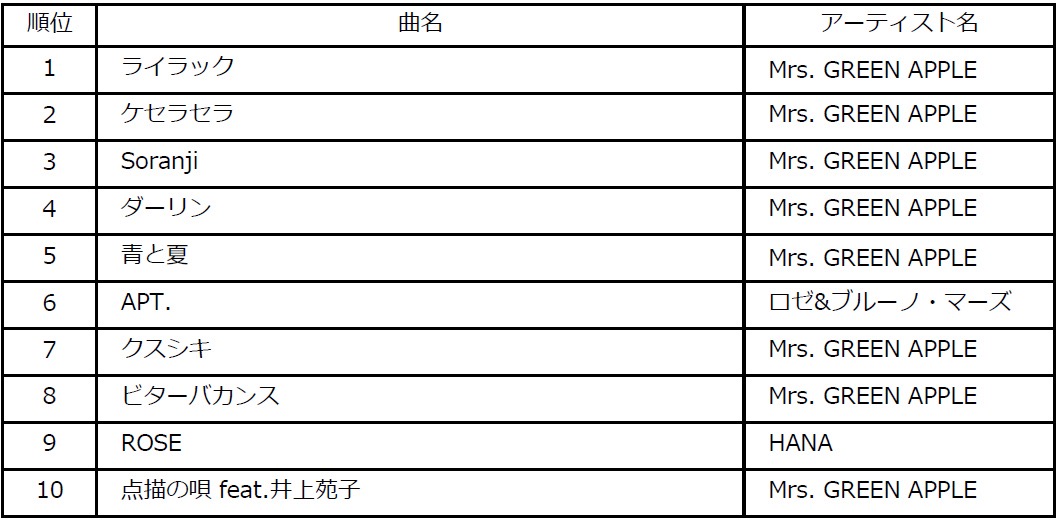 続く2位はMrs. GREEN APPLE「ダーリン」。2024年12月25日にNHK総合で放送された『Mrs. GREEN APPLE 18祭』のテーマソングとして書き下ろされた楽曲。そして3位はロゼ&ブルーノ・マーズ「APT.」と、1年間を通じたロングヒット曲が並ぶなか、4位には米津玄師「IRIS OUT」(2025年9月リリース)が食い込んだ。5位はMrs. GREEN APPLE「クスシキ」。Mrs. GREEN APPLEはトップ5内に3曲、トップ10内に5曲を送り込むという強さを見せた。