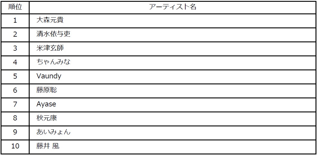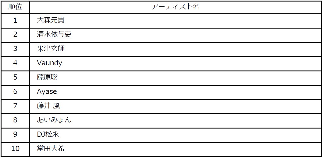 2位はドラマ『あなたを奪ったその日から』の主題歌「ブルーアンバー」がヒットしたback number、3位は「Plazma」が年間ダウンロード・ソングを制した米津玄師が獲得。4月にメジャーデビューしたばかりのHANAが5位、そしてHANAのプロデューサーを務めるちゃんみなも10位に入っている。