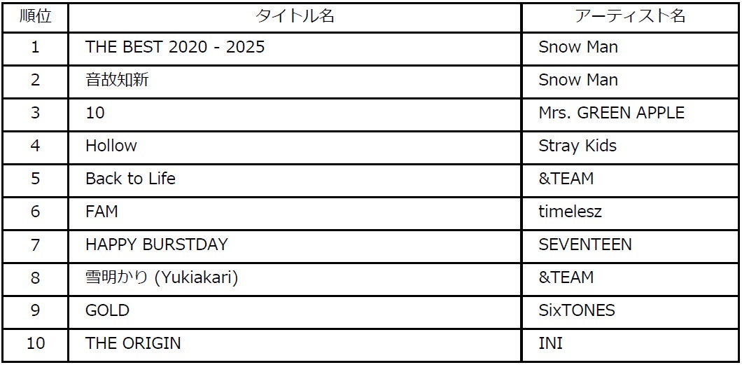 総合アルバム・チャート【Billboard JAPAN Hot Albums】では、Snow Manが2024年に引き続き首位に。これによってSnow Manは史上初となる、“Hot Albums”で通算3回の年間首位獲得を達成した(2022年『Snow Labo. S2』、2024年『RAYS』、2025年『THE BEST 2020-2025』)。