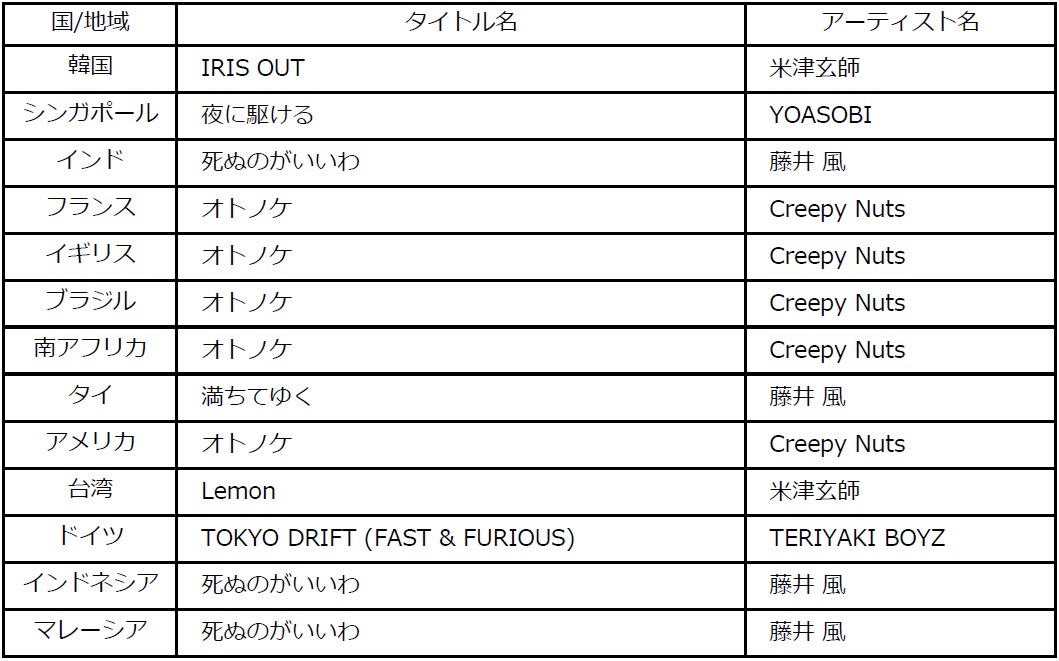 日本人アーティストによる海外公演の活発化、国際音楽賞『MUSIC AWARDS JAPAN』の開催など、音楽のグローバル化の機運が高まる昨今。世界でヒットしている日本の楽曲チャート“Global Japan Songs Excl. Japan”では、Creepy Nuts「オトノケ」が首位を獲得した。加えて、Japan Songs(国/地域別チャート)では、5つの国と地域で首位に輝いた。