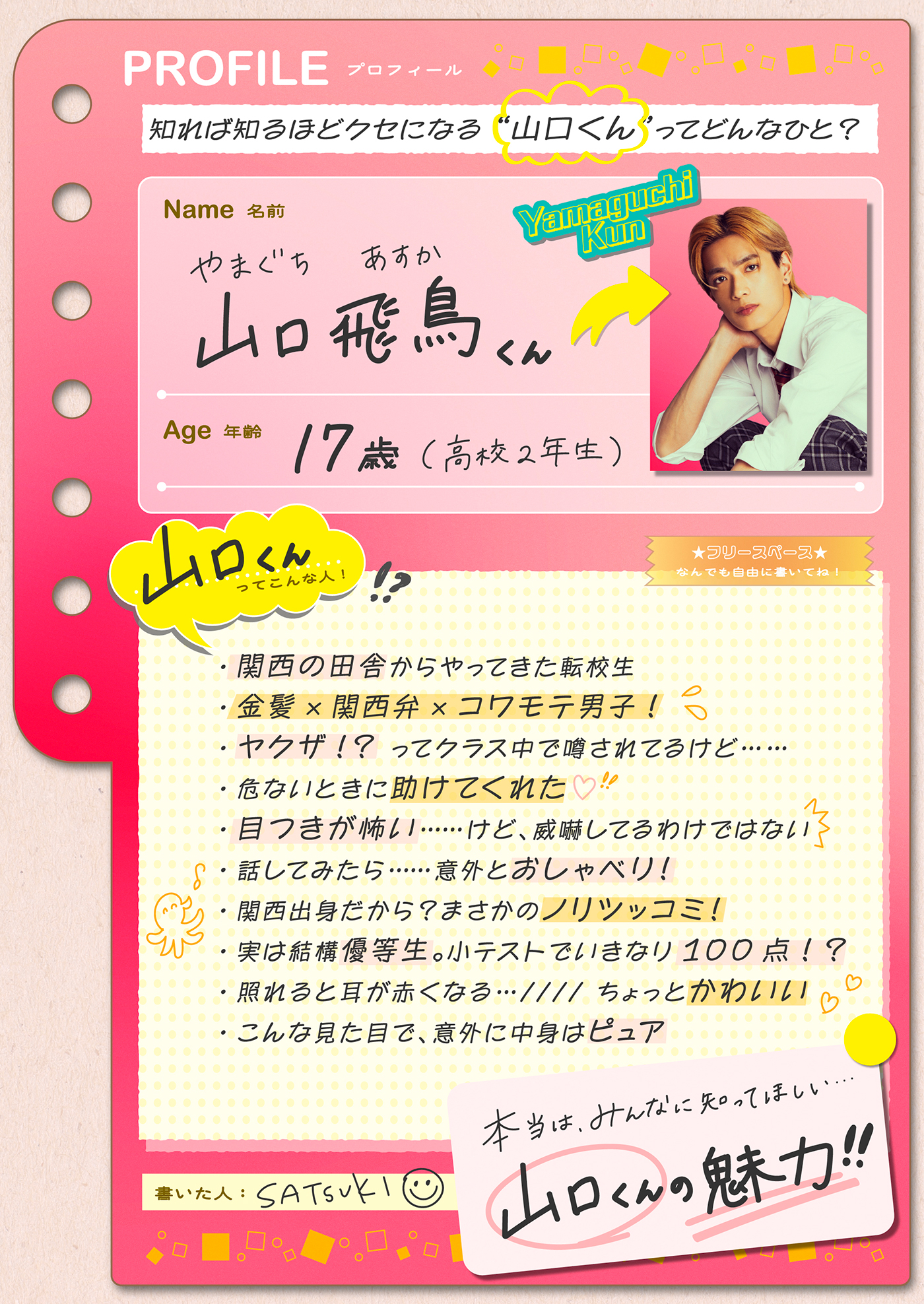 ヒロイン目線で山口くんの魅力を紹介するプロフィールビジュアルも解禁となった。みんなが知らない山口くんの中身をこっそり紹介しており、ますます山口くんのことを知りたくなる内容が盛りだくさんとなっている。