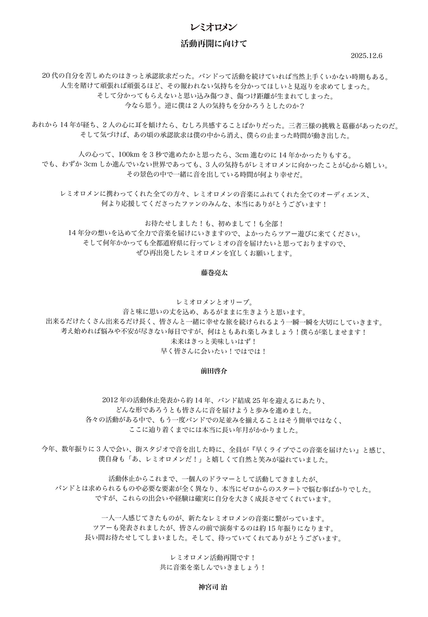 2012年の活動休止発表から約14年、バンド結成25年を迎えるにあたり、どんな形であろうとも皆さんに音を届けようと歩みを進めました。各々の活動がある中で、もう一度バンドでの足並みを揃えることはそう簡単ではなく、ここに辿り着くまでには本当に長い年月がかかりました。今年、数年振りに3人で会い、街スタジオで音を出した時に、全員が「早くライブでこの音楽を届けたい』と感じ、僕自身も「あ、レミオロメンだ!」と嬉しくて自然と笑みが溢れていました。