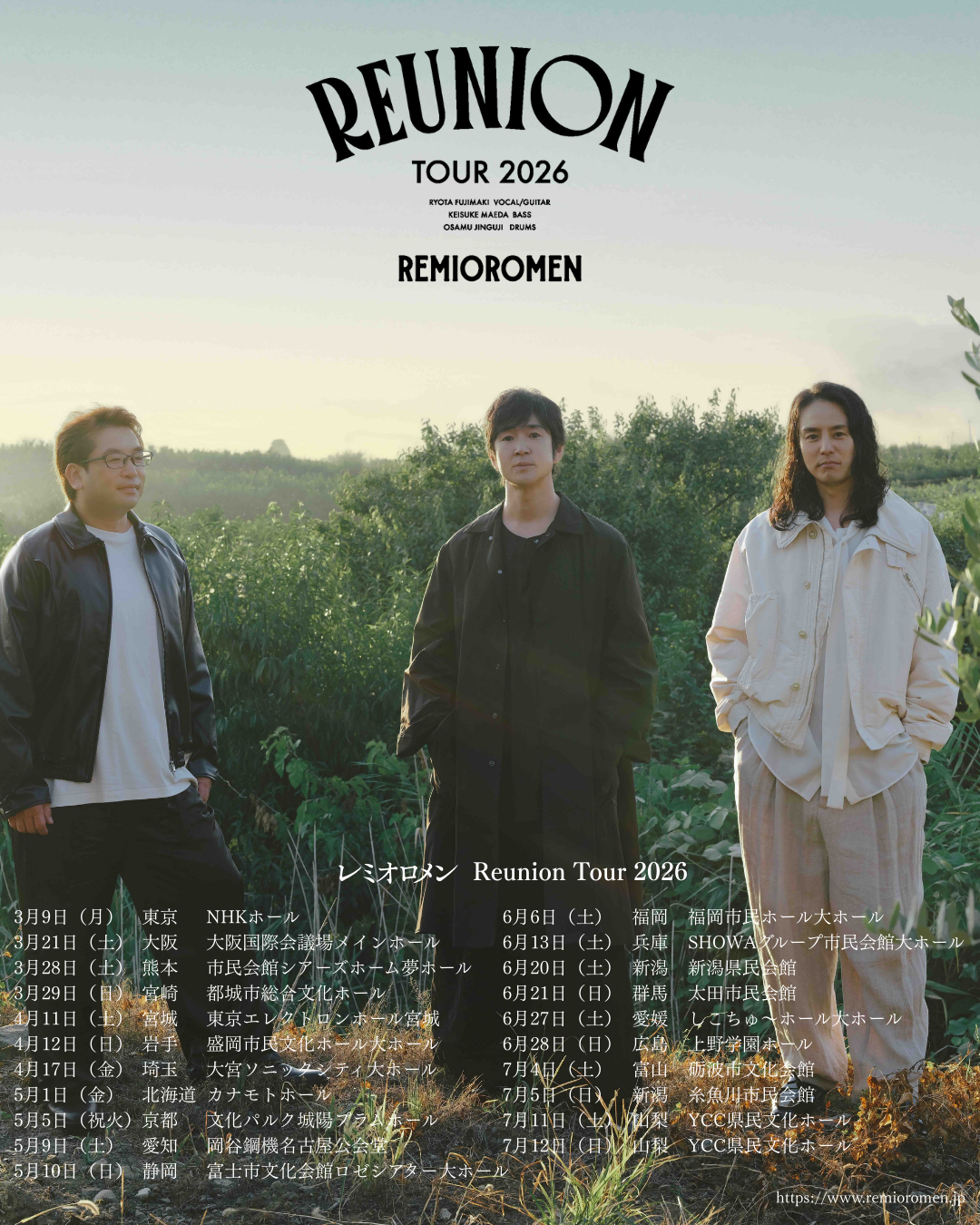 オフィシャルYouTubeチャンネルでは、バンドの代表曲である「雨上がり」「粉雪」のスタジオライブが披露され、3人の最新映像が公開。オープニングでは、再結合を意味する“Reunion”の文字が大々的に表示され、エンディングでは、『レミオロメン Reunion Tour 2026』の開催を発表されている。