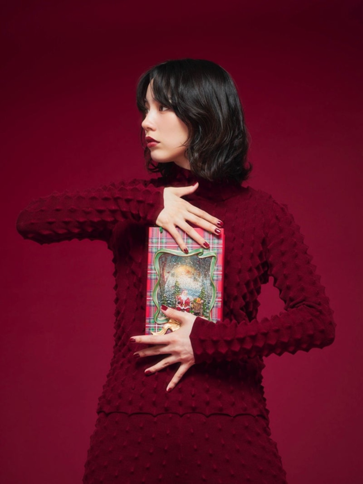 クリスマス仕様の小さなギフトバッグを手に、床に座ってカメラを見つめるカットや、両手でバッグを包み込むようなポーズ、横顔で視線を外したシリアスな表情など、可憐さと芯の強さが同居する仕上がりとなっている。