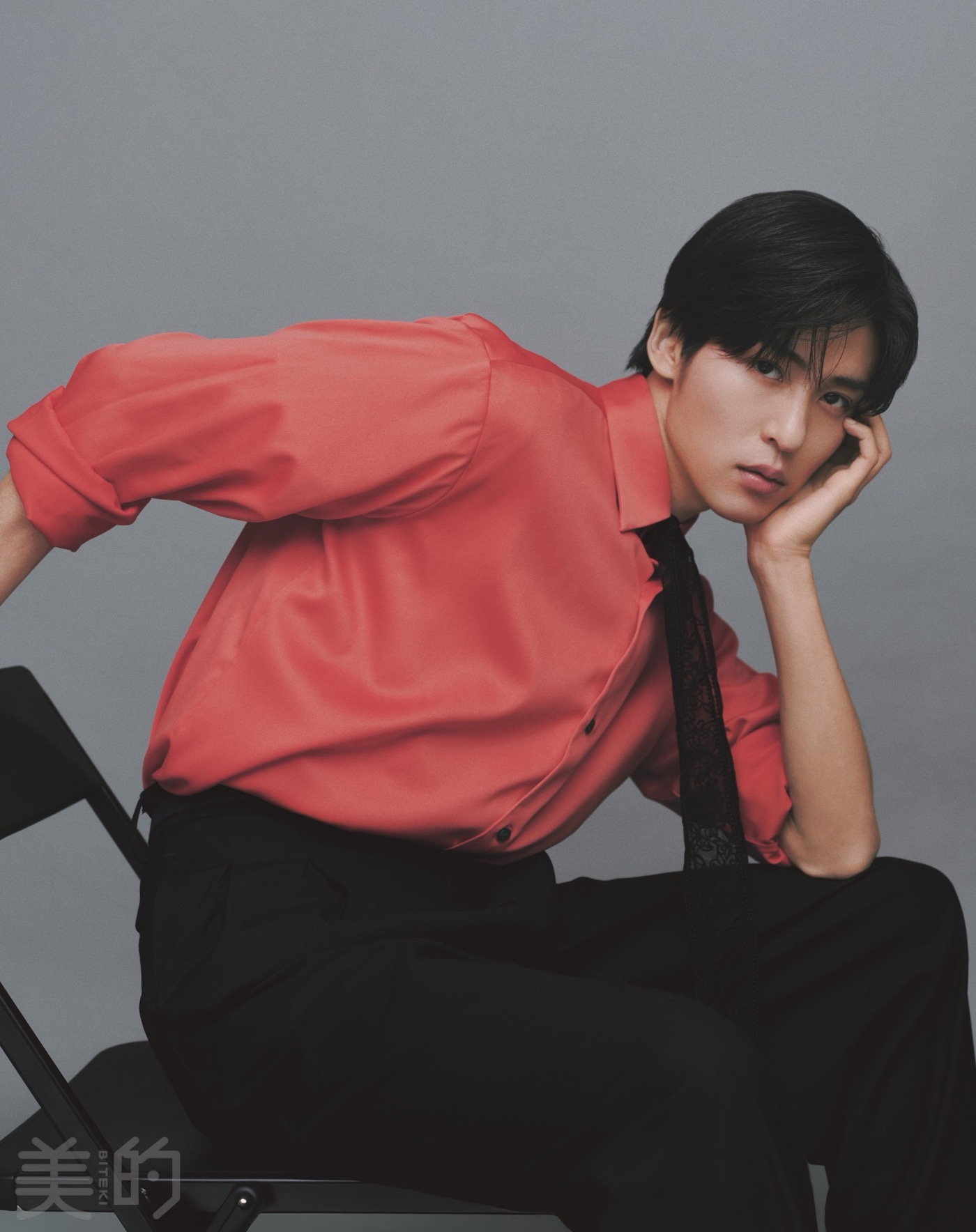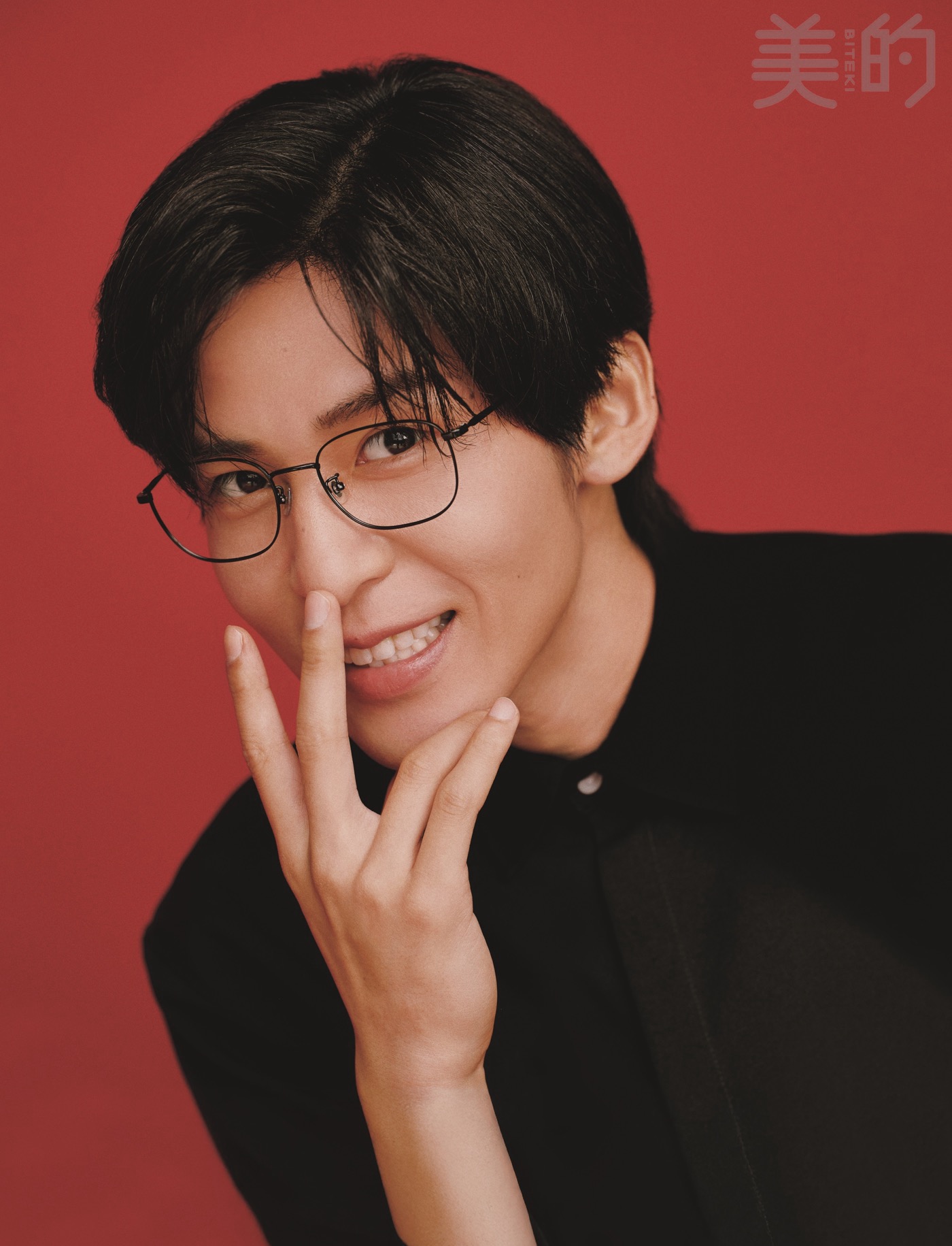 今回は、そんな目黒の内なる情熱を感じさせる赤と黒をテーマに撮影を敢行。表紙には、黒シャツ×眼鏡で知的な眼差しを見せる目黒と、赤い背景のコントラストが印象的なカットをチョイス。一方、中面では、赤いシャツをまとったワイルドなカットも。クールで落ち着きがありながらも、あくなき情熱をまとう――。そんな目黒のアンビバレントな魅力にフォーカスしている。