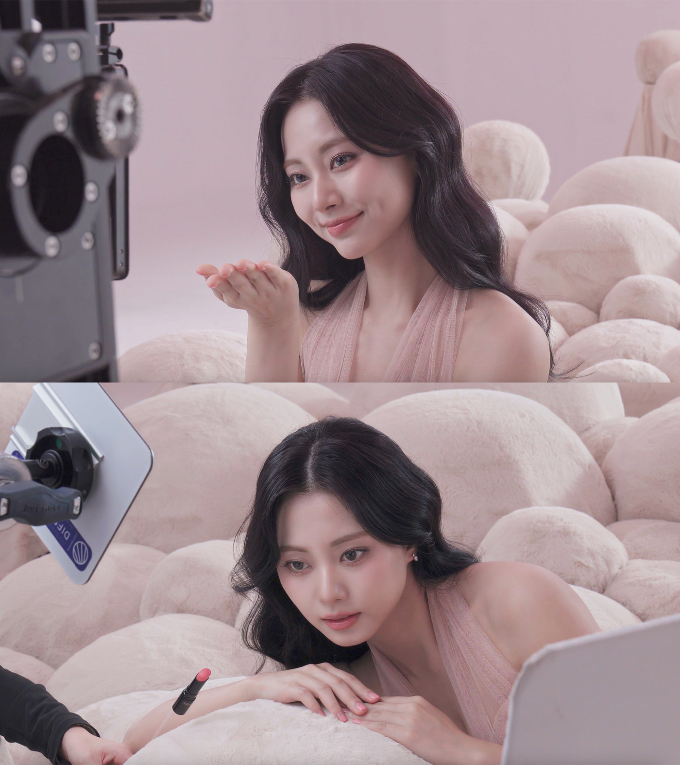 透明感溢れるピンクのワンピースで登場したツウィ。雲のようにふわふわとしたベッドに身を預け、気持ちよさそうに眠るシーンから撮影がスタート。まどろむようなやわらかな表情やそっと動く手元の仕草に、スタジオはリラックスしたムードに包まれ、撮影は順調に進んだ。