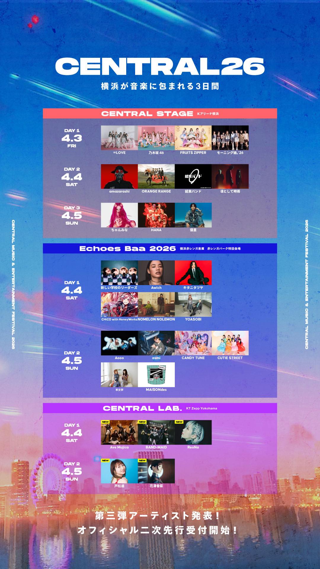 4月3日から5日までの3日間、横浜を舞台に開催される都市型フェス『CENTRAL MUSIC & ENTERTAINMENT FESTIVAL 2026』。