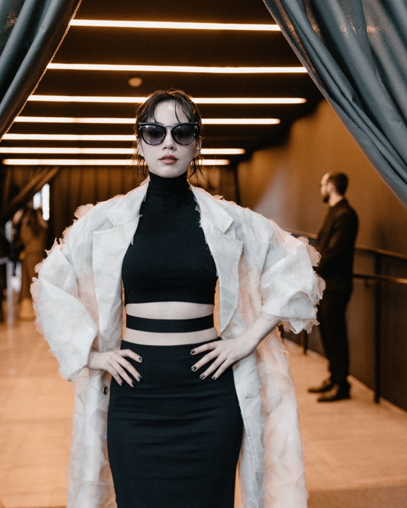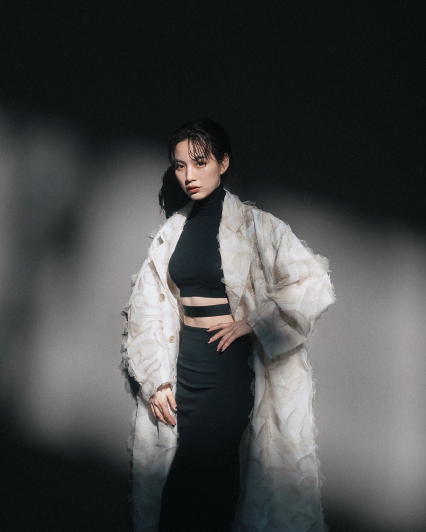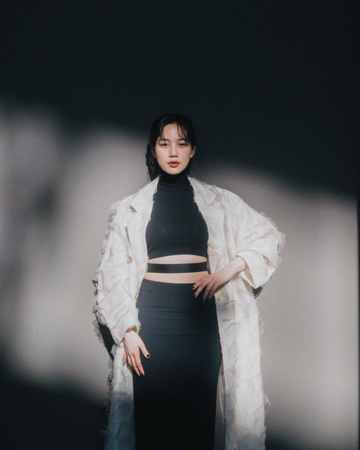 ブラックのハイネックトップスにタイトなロングスカートを合わせた洗練されたスタイルに、立体感のある淡いカラーのロングコートを羽織ったモードな装い。ウエスト部分の大胆なカッティングがシャープな印象を際立たせ、引き締まったウエスト、スタイルの良さが際立つコーディネートとなっている。さらに、サングラスをかけたクールな姿や、光と影が交差する空間で壁にもたれながら凛とした表情を見せるショットなど見どころ満載だ。
