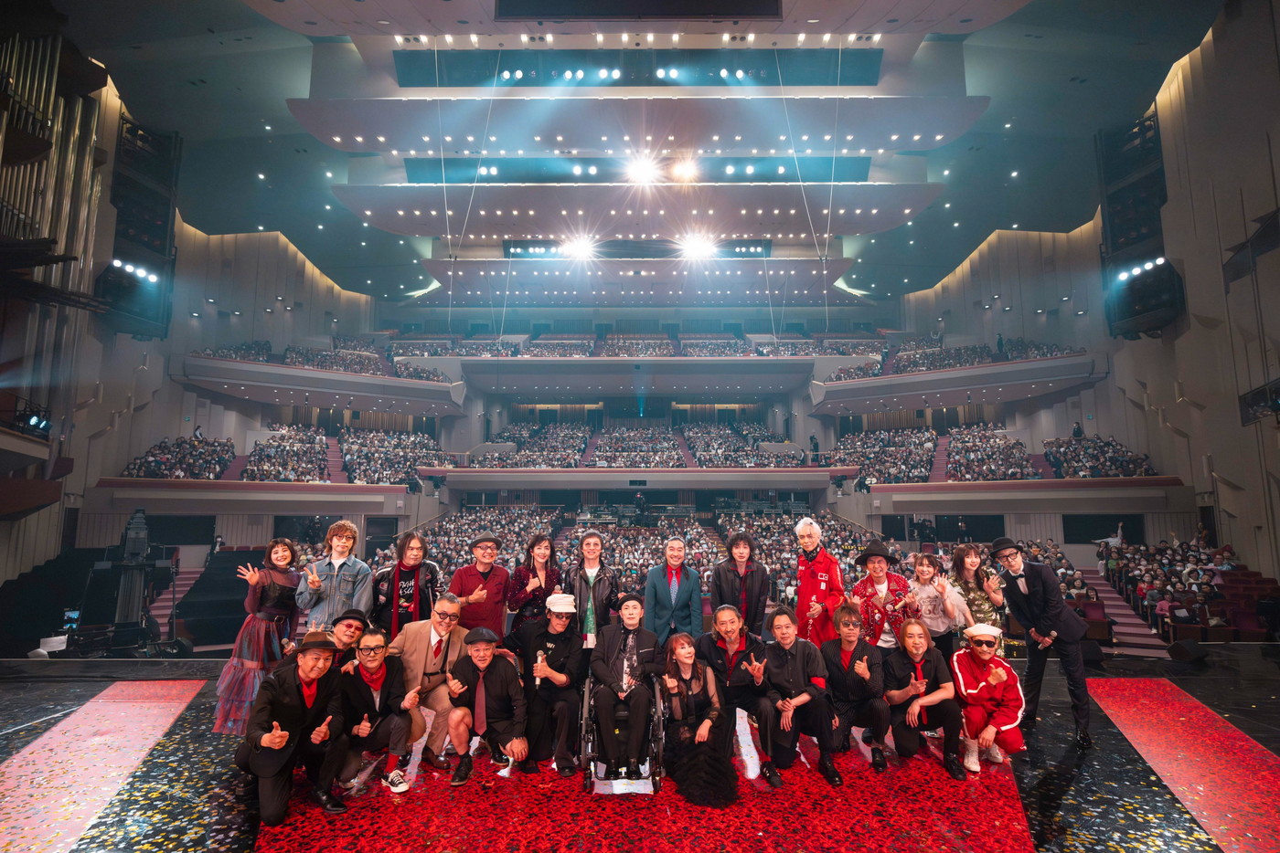 先日、東京・大阪でのライブを大盛況に終えたばかり。熱気冷めやらぬなか、熱く濃厚なライブパフォーマンスが繰り広げられた。NHKホールでの『カバーズフェス』には、ROOTS66から18名の豪華ミュージシャンが集結。ライブのオープニングは、【ROOTS66 GREAT SINGERS】から、宮田和弥[JUN SKY WALKER(S)]、大槻ケンヂ(筋肉少女帯/特撮)、増子直純(怒髪天)、斉藤和義、早見 優、八熊慎一(SPARKS GO GO)、永井真理子、トータス松本(ウルフルズ)による、ジュリーの名曲「勝手にしやがれ」で幕を開けた。冒頭から劇的な登場に、会場は一気にヒートアップ。豪華メンバーによるトークも大盛り上がりの展開に。終盤では、宮田和弥、中川 敬、斉藤和義の3人で、ジョン・レノン「イマジン」をRCサクセションのカバーバージョンで披露。MCのリリー・フランキー&上白石萌歌、そして観客を魅了して止まない、深く心に響きわたるパフォーマンスとなった。