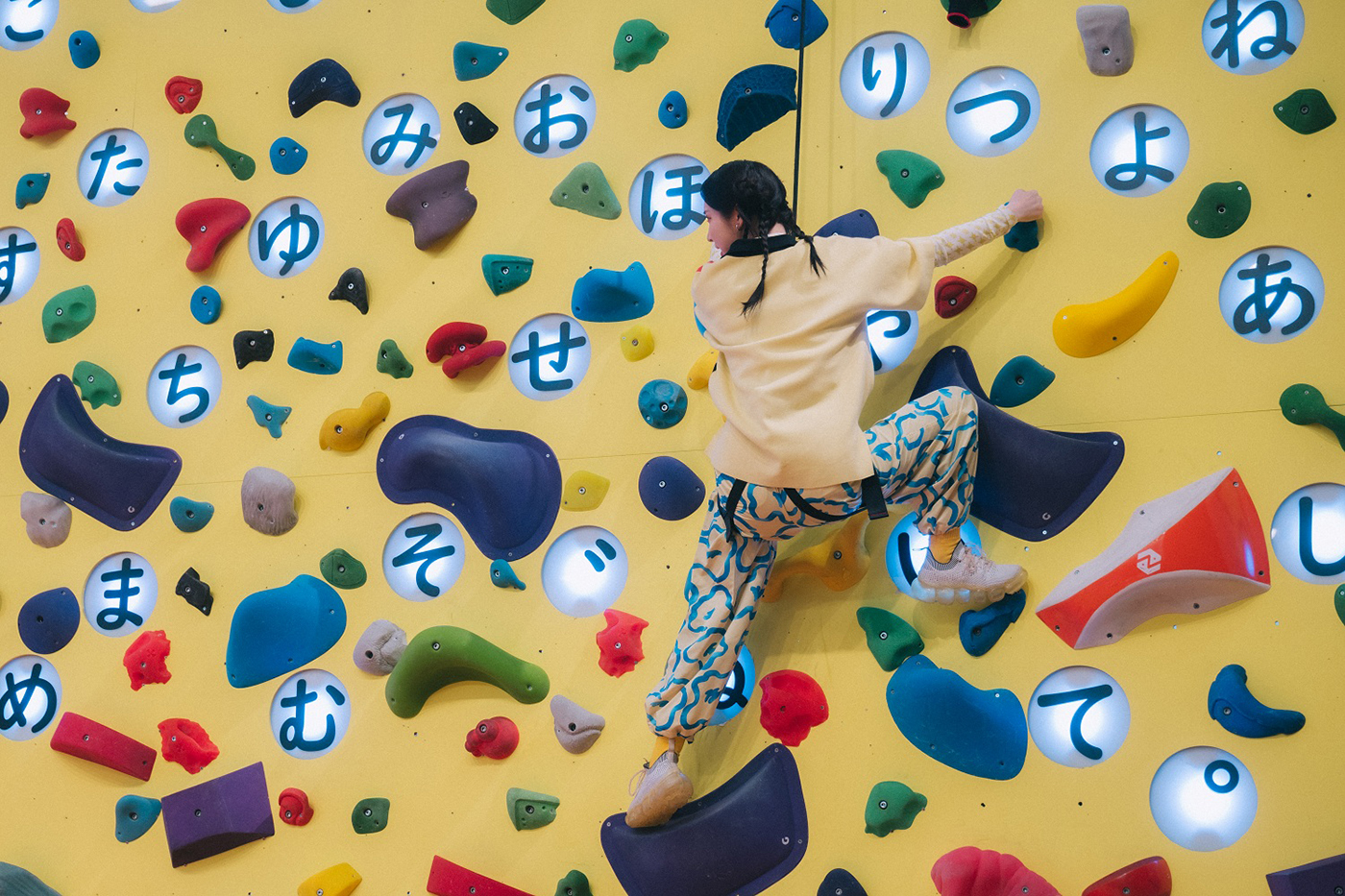 チームメンバーが描いた絵の名前を、壁に散らばった五十音のボタンを押して答えるクライミングクイズゲーム。
