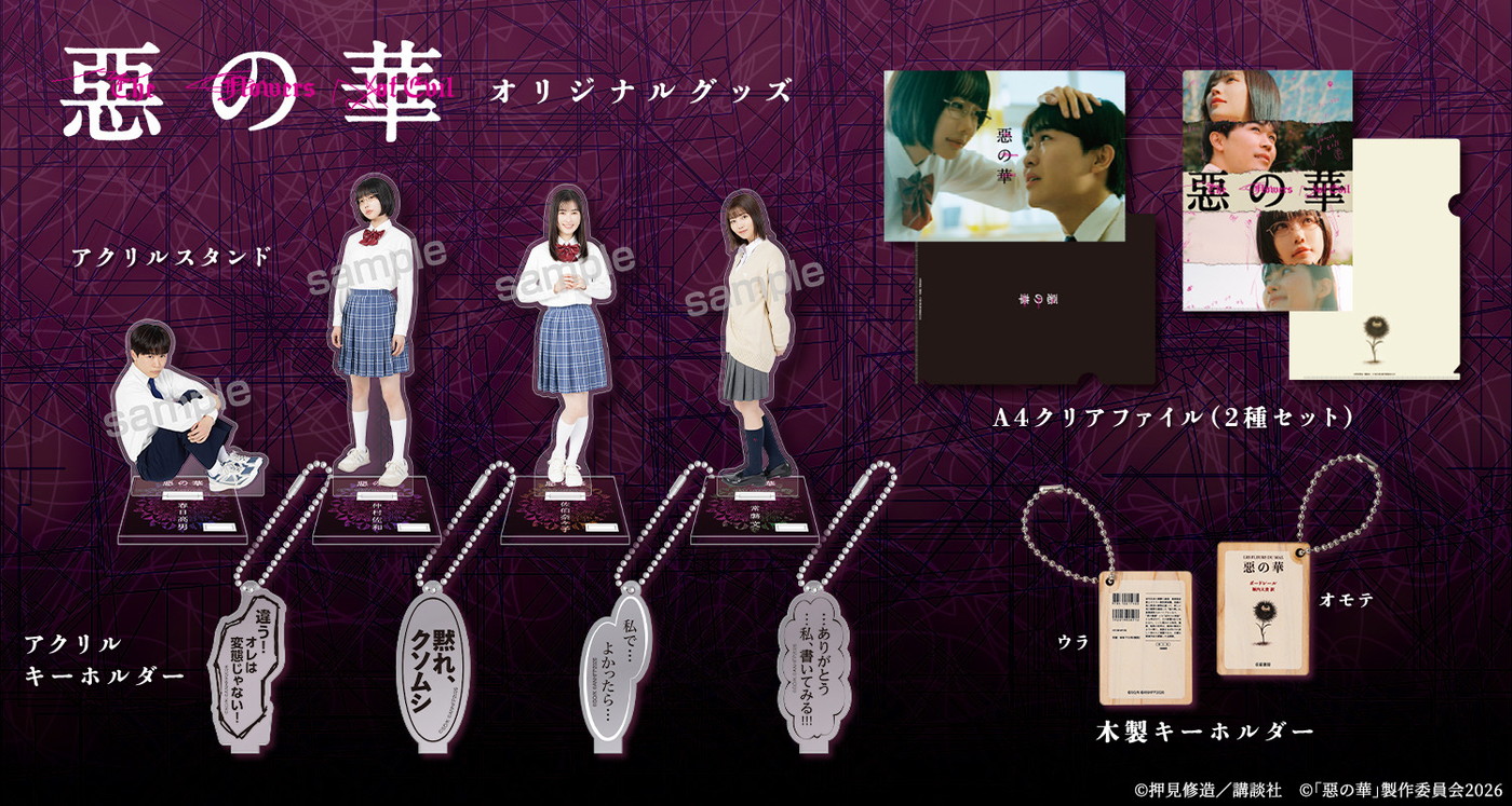 ドラマの放送を記念し、番組オリジナルグッズの発売が決定。第1弾は、メインキャラクターである、春日、仲村、常磐、佐伯の制服姿のアクリルスタンドや、クリアファイル、吹き出しデザインのアクリルキーホルダーに、詩集『惡の華』の木製キーホルダーをラインナップ。原作ファンも必見のグッズが勢ぞろいとなっている。