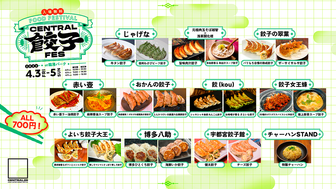 あわせて、全国各地から個性あふれる人気餃子が集結する『CENTRAL 餃子フェス』の開催も決定。