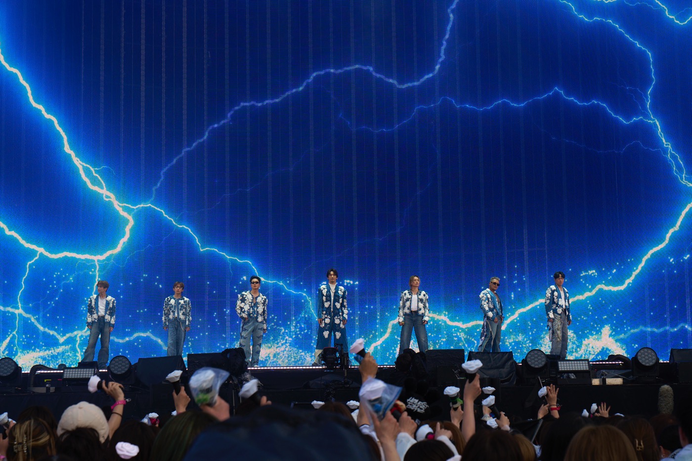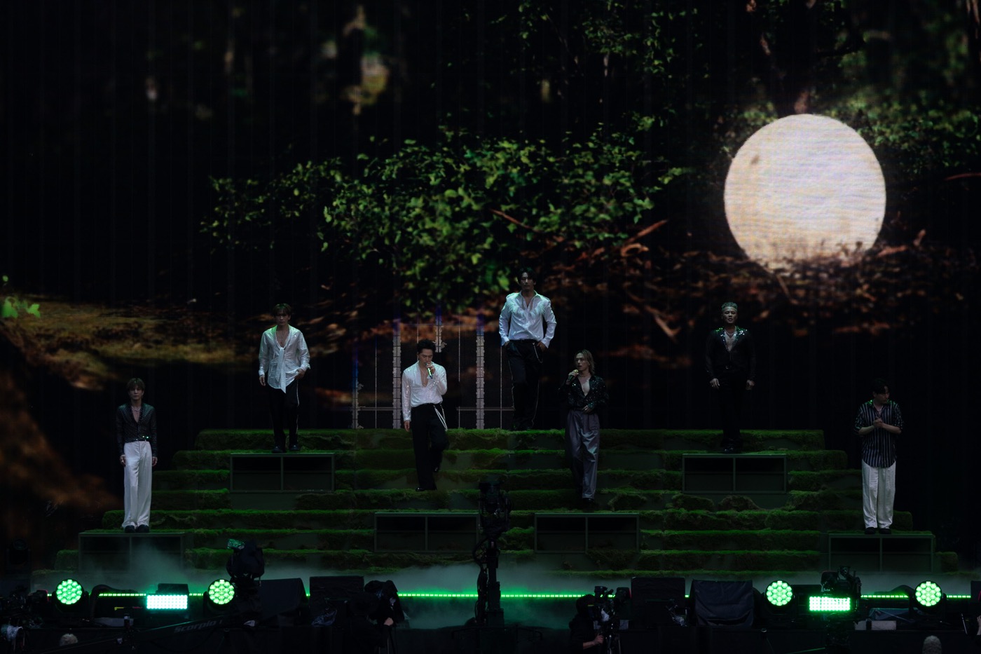 再びステージに7人が揃うと、スクリーンには降りしきる雨の映像が。後半戦の幕開けを飾ったのは、3月にリリースされたミニアルバム『ONE』のリード曲「Through The RAIN」だ。この日初披露となった楽曲を通して、7人は「仲間とともにこの先も歩み続ける」というメッセージをスタジアムに刻んでいく。