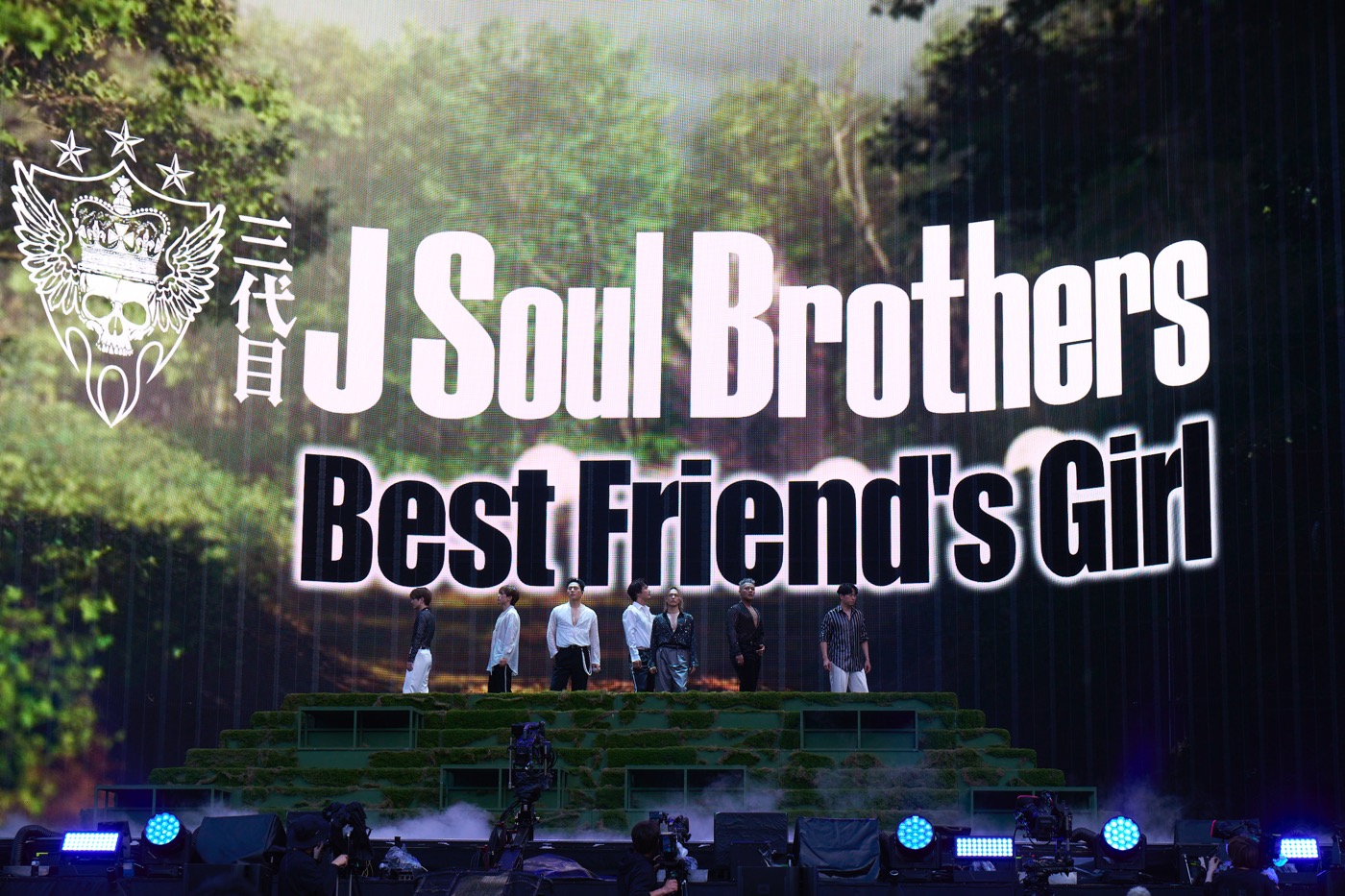 「LET’S PARTY」からはムービングステージで会場の奥まで向かい、「JSB Blue」で青空に突き抜けるような爽快なサウンドを届ける。「Welcome to TOKYO」「FIGHTERS」「1st Place」を経て、「Feel The Soul」では青空の下に響く約5万人のシンガロングを受けながら優しい眼差しを向ける7人。メインステージでは「J.S.B.」と書かれた青いフラッグが振られ、カラフルなバルーンがアリーナを弾む。