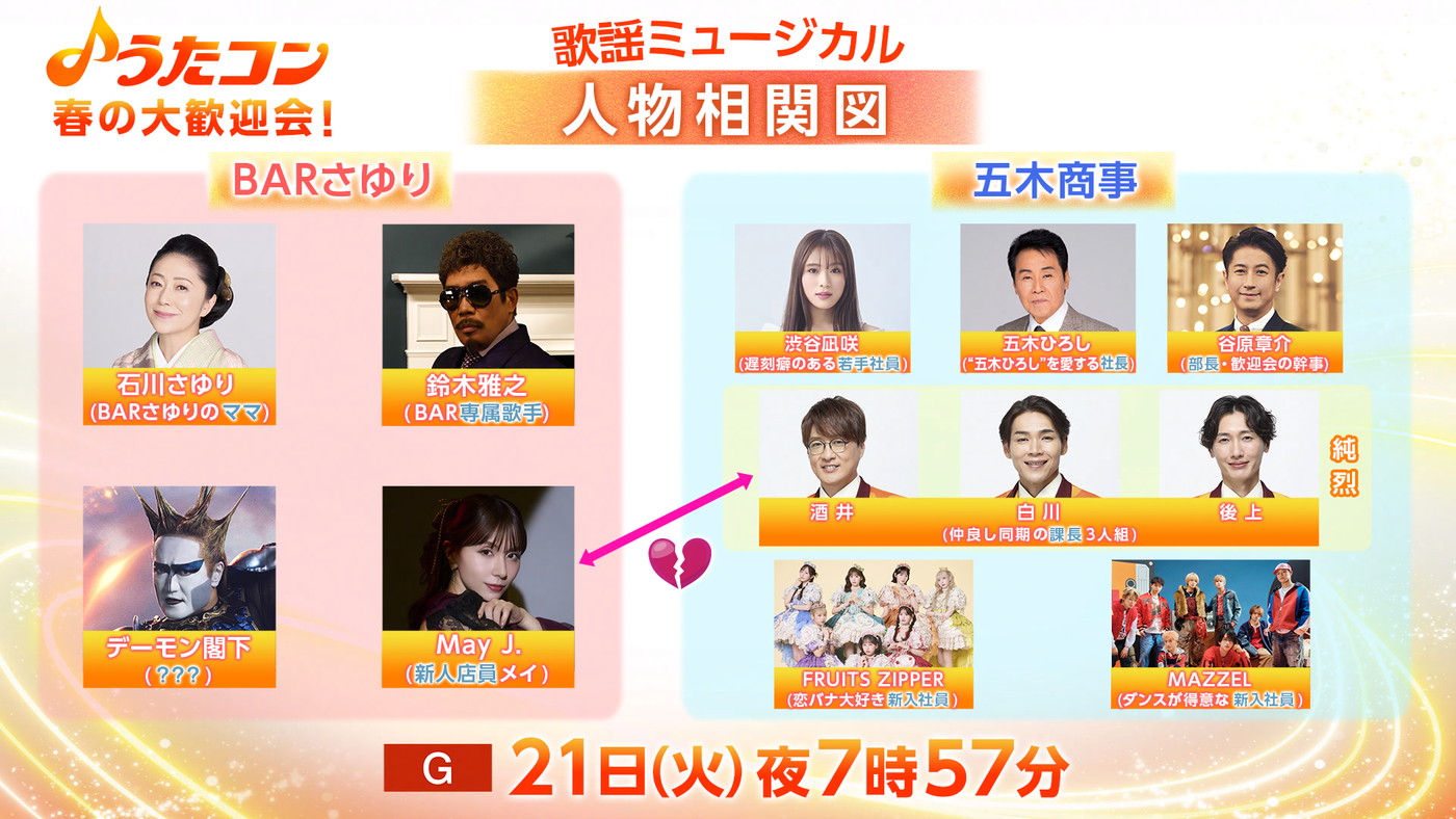 劇中、2025年に『紅白』初出場のFRUITS ZIPPER(新入社員)、8人組ボーイズダンスボーカルグループ・MAZZEL(新入社員)の最新曲は、うたコンだけのスペシャルな共演で届ける。