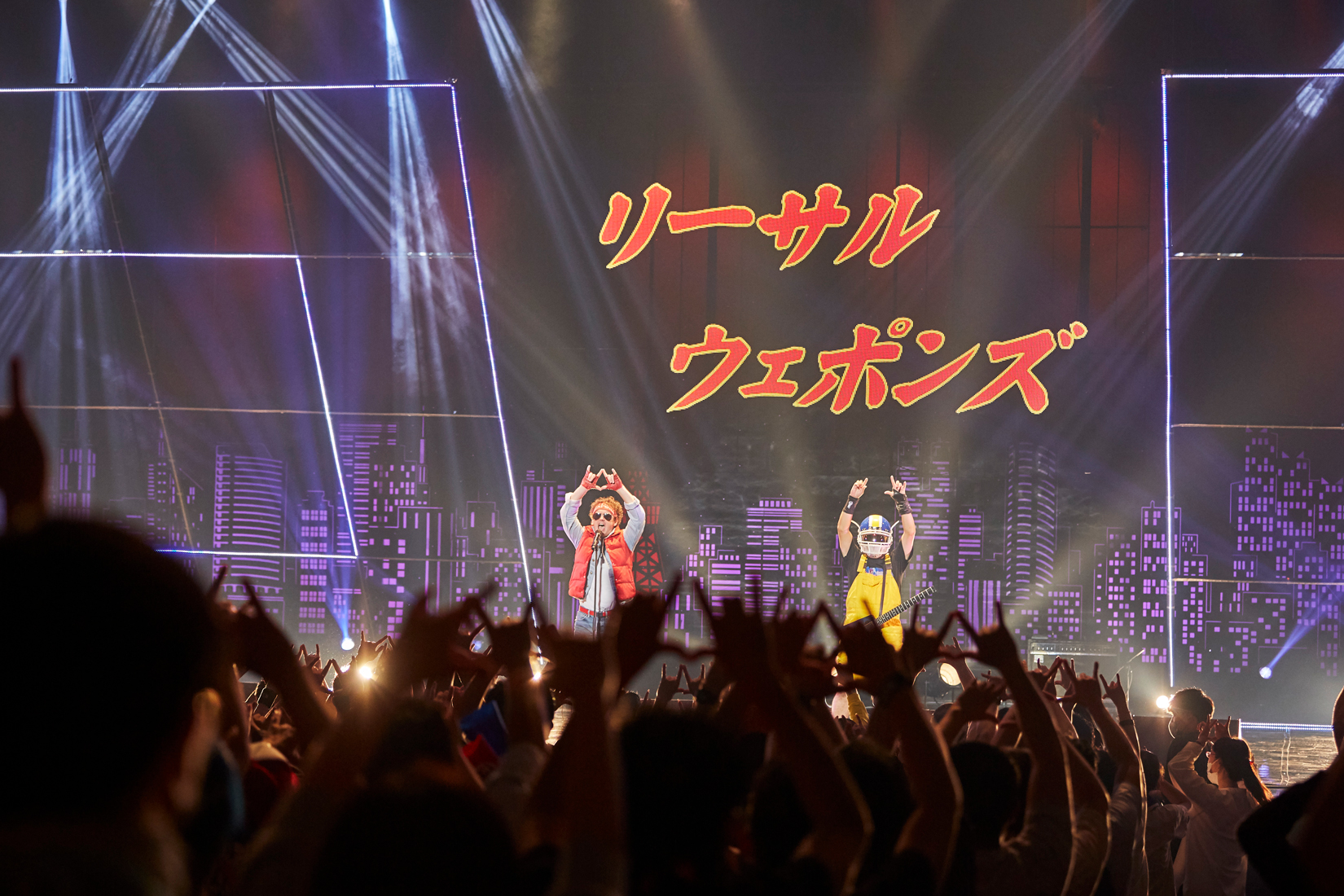 ライブ前の注意事項アナウンスは、ザ・リーサルウェポンズが出会ったブックマート都立家政店(中野区)の河村陽介氏が担当。東京の夜景をモチーフにした絵がステージに映され、“アニキ!アニキ!”コールからはじまる「80年代アクションスター」、そして、ユニットのテーマソング「ポンズのテーマ」でライブは幕を開けた。