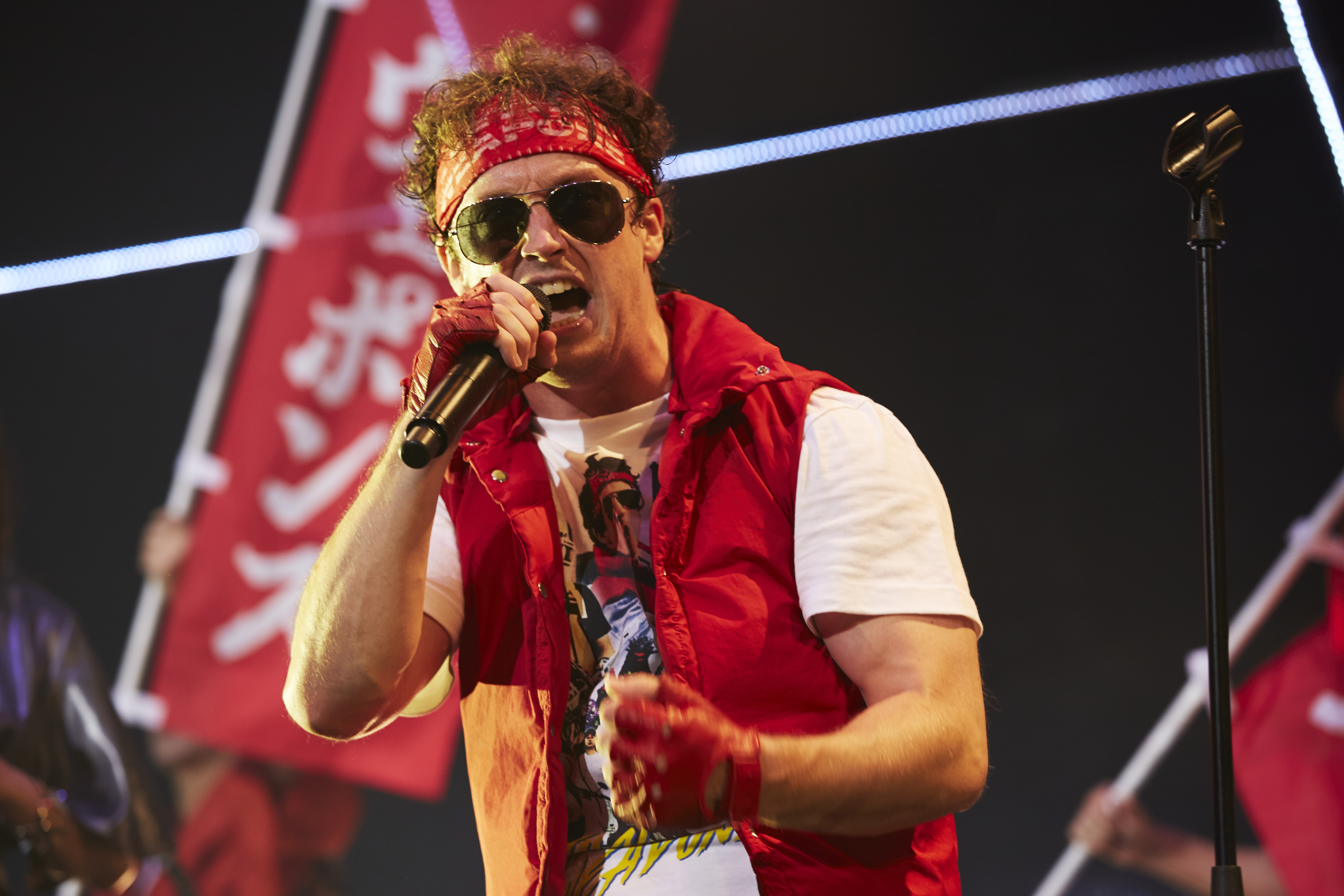 特別なライブとなったこの日はゲストも豪華。まずはシンガーソングライターの眉村ちあき。和服姿で本物の殺陣の方々とチャンバラを繰り広げた後、刀を掲げたまま「こんばんは!眉村ちあきです!」と笑顔で挨拶。じつはアイキッドは、眉村の活動をはじめた当初からチェックしていたという古参ファン。さらにザ・リーサルウェポンズが初ライブを行ったライブハウス“阿佐ヶ谷家劇場”が、眉村も何度も出演していた会場だったことから縁がつながり、コラボ曲「サムライディスコfeat.眉村ちあき」のリリースに至った(しかも8センチCDで)。“シンセウェイブ3部作・第2弾”として制作されたこの曲は、“サイバー演歌”と呼ぶべきナンバー。眉村の圧倒的な歌唱力(コブシ回しもうまい!)とレトロフューチャー的なサウンドはこの日のステージでも鮮烈な化学反応を生み出した。