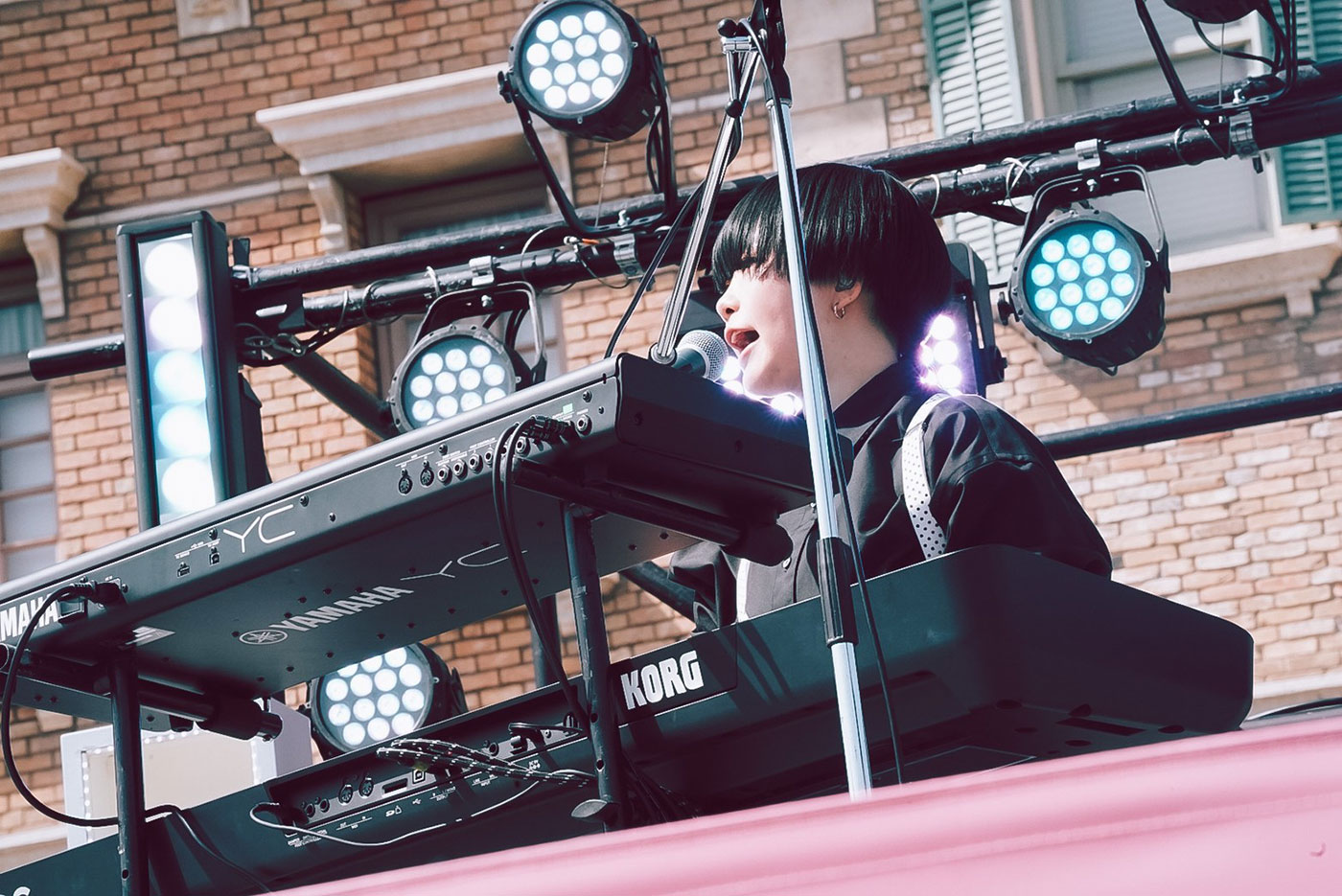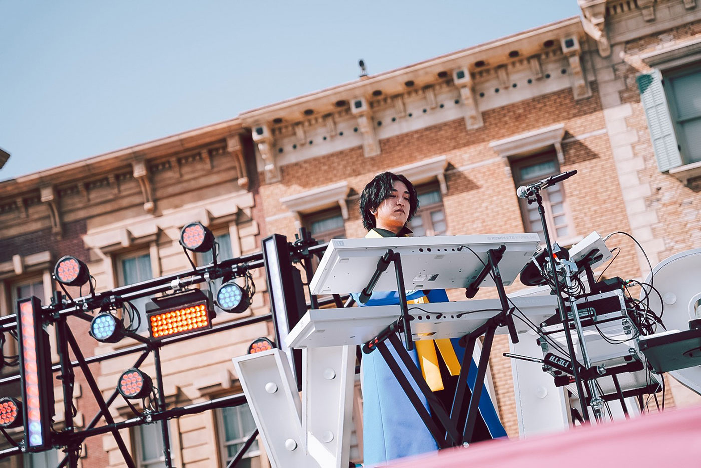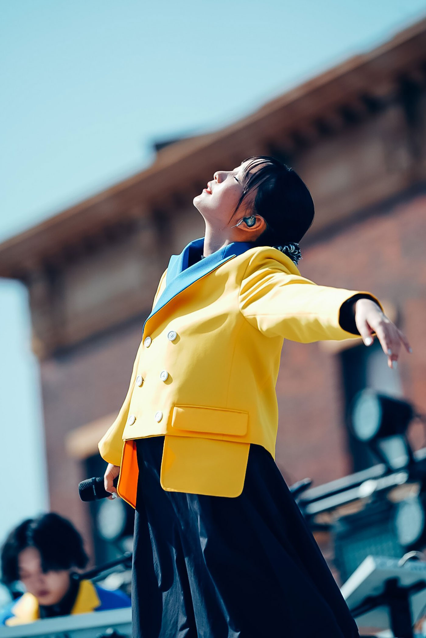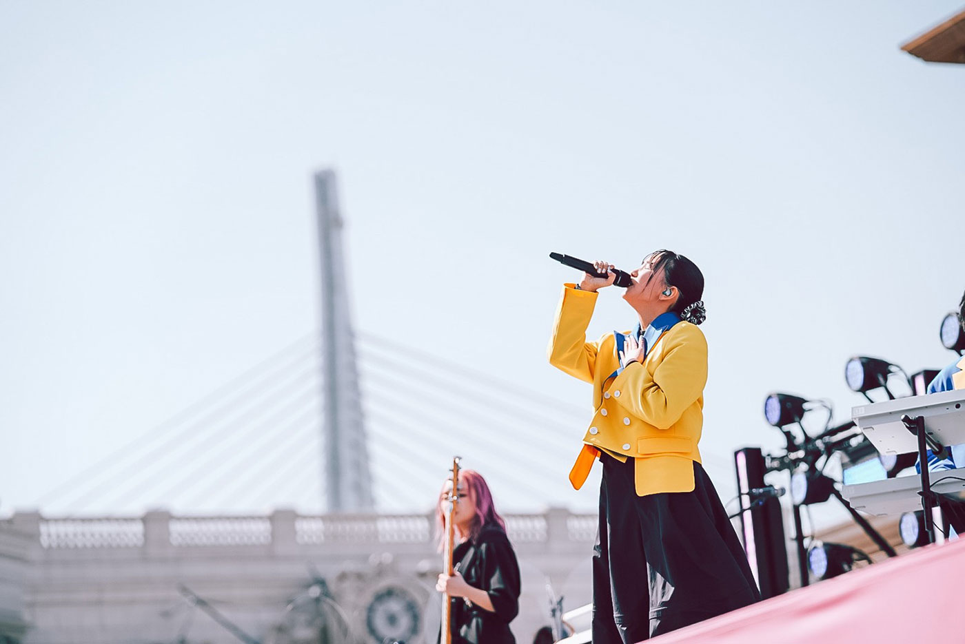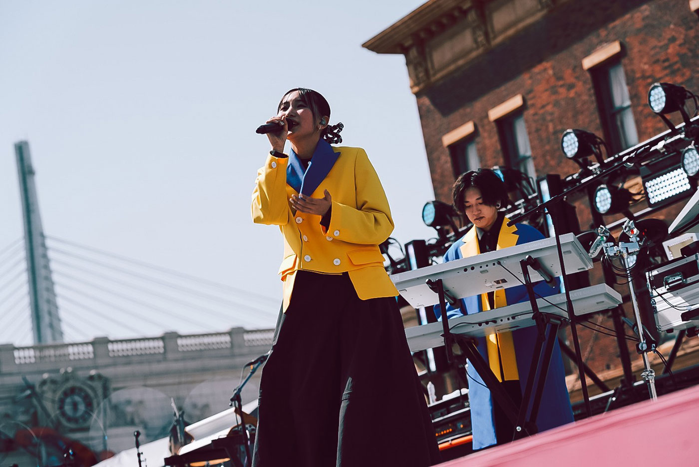 その光景にボーカルのikuraが「みんな聞こえてるよ、ありがとう! 元気を出して、声を出して、楽しんでいきましょう!」とうれしそうに呼び掛け、会場を埋め尽くすクラップに支えられた「三原色」でも華やかなステージングで魅せていく。「最高だね~! こんなに天気に恵まれて……皆さんの声が聞けるのは初めてで本当にうれしいです。YOASOBIと一緒に特別な一日にしていきましょう!」と、ikuraも心底楽しいという表情。結成も間もなくコロナ禍にブレイクを果たしたYOASOBIにとって、観客の生の声は何ものにも代えがたい宝物となったことだろう。