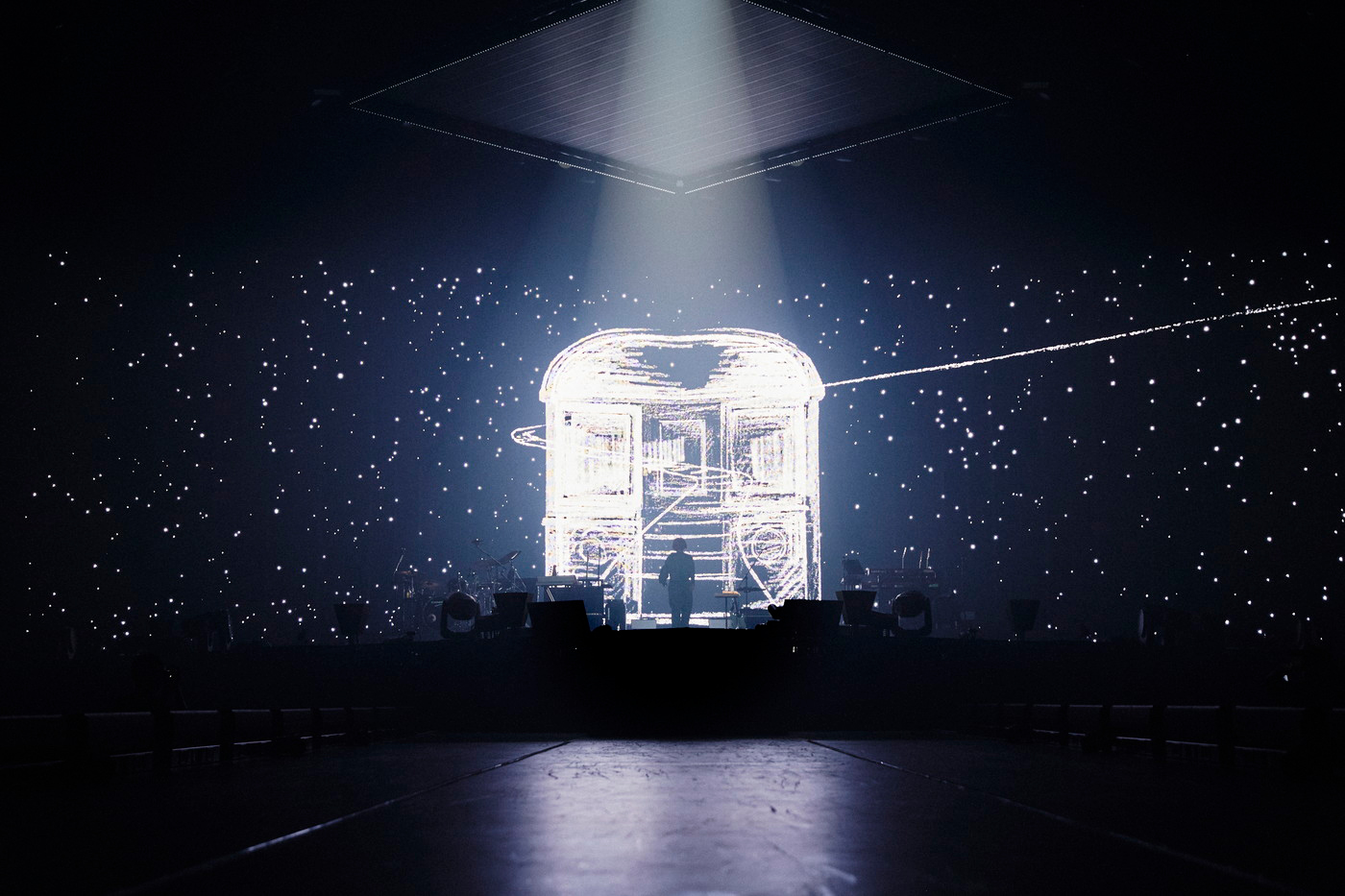 舞台上にスタンバイした彼らが鳴らしたオープニングナンバーは「カムパネルラ」。タイトなバンドアンサンブルと美しい白光によるモノクロのストイックな演出で、曲の最後には米津の背後に星空が広がり、星間を結ぶ線路の上を“銀河鉄道”が走り抜けていき、冒頭から一気に観る者を空想の世界へと誘った。