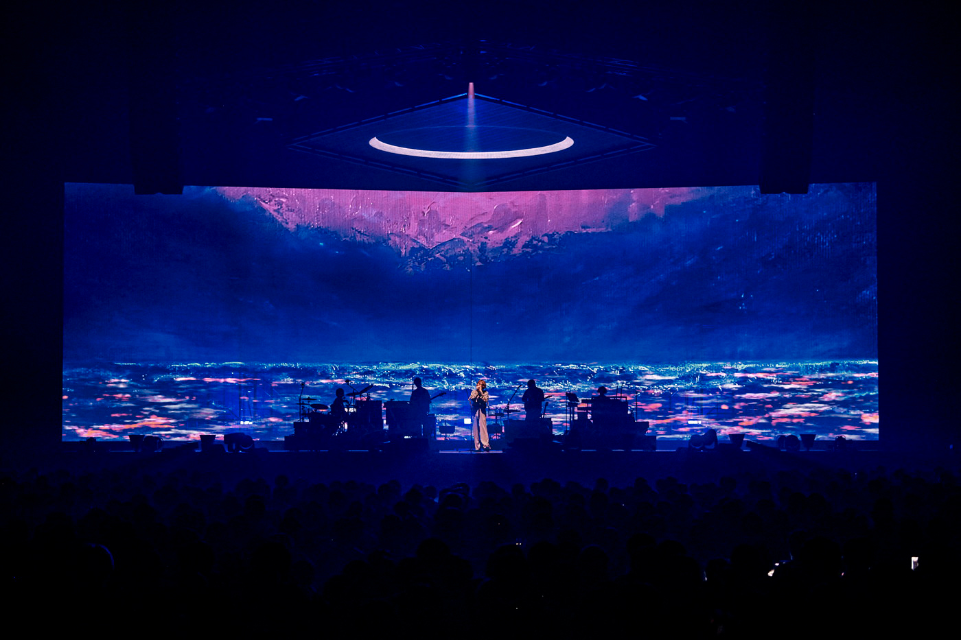 張り詰めるような悲しさに覆われた「月を見ていた」の夜の海辺は、続く「打上花火」で絵画による夜の海辺へと情景を変え、「あの日見渡した渚を 今も思い出すんだ」と歌いはじめる。ラストサビでは、暗闇のなか、天井に大きな花火の照明が打ち上げられ、会場全員で夏の花火を見ているかのような錯覚に陥った。
