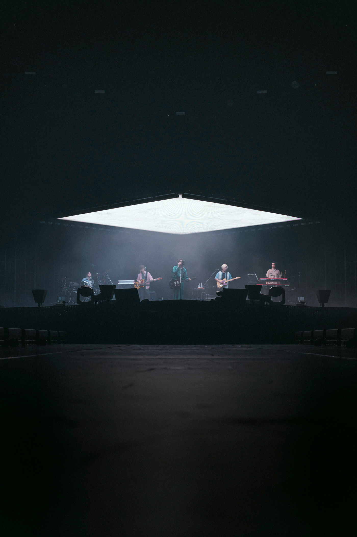 続く曲は1stアルバム『diorama』の1曲目「街」。イントロから会場内に驚きの歓声があがり、天井からLEDによる白のキャンバスが下降、メンバーの頭上に着地した。キャンバスにより照らされた、狭く閉ざされた空間のなかで、米津は自身が米津玄師として最初に出した曲を再確認するかのように歌い上げた。
